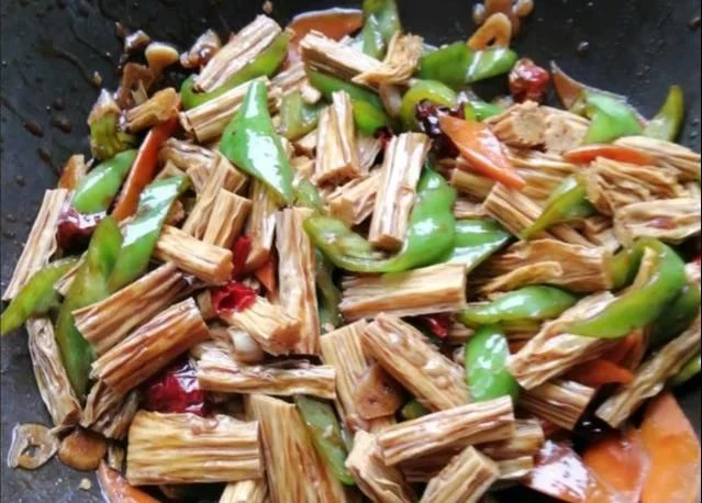 3.在锅中倒入适量的基础油,开火,直到油温升至70%的热量,再加入葱姜蒜,绿色和红色辣椒丝,迅速搅出香气,倒入泡沫制成的腐竹,然后在高温下炒半分钟,加适量的食用盐和蚝油调味,翻炒,撒上几片香菜,然后再次翻炒,然后关闭火锅。简单可口的油炸腐竹已经准备就绪。