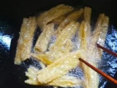 2.在锅中倒入适量的食用油,将其燃烧至60%的热量,将沥干的腐竹倒入油锅中,炸半分钟,然后将其取出。它不能炸得太久,很容易炸糊了,最好炸半分钟为宜。