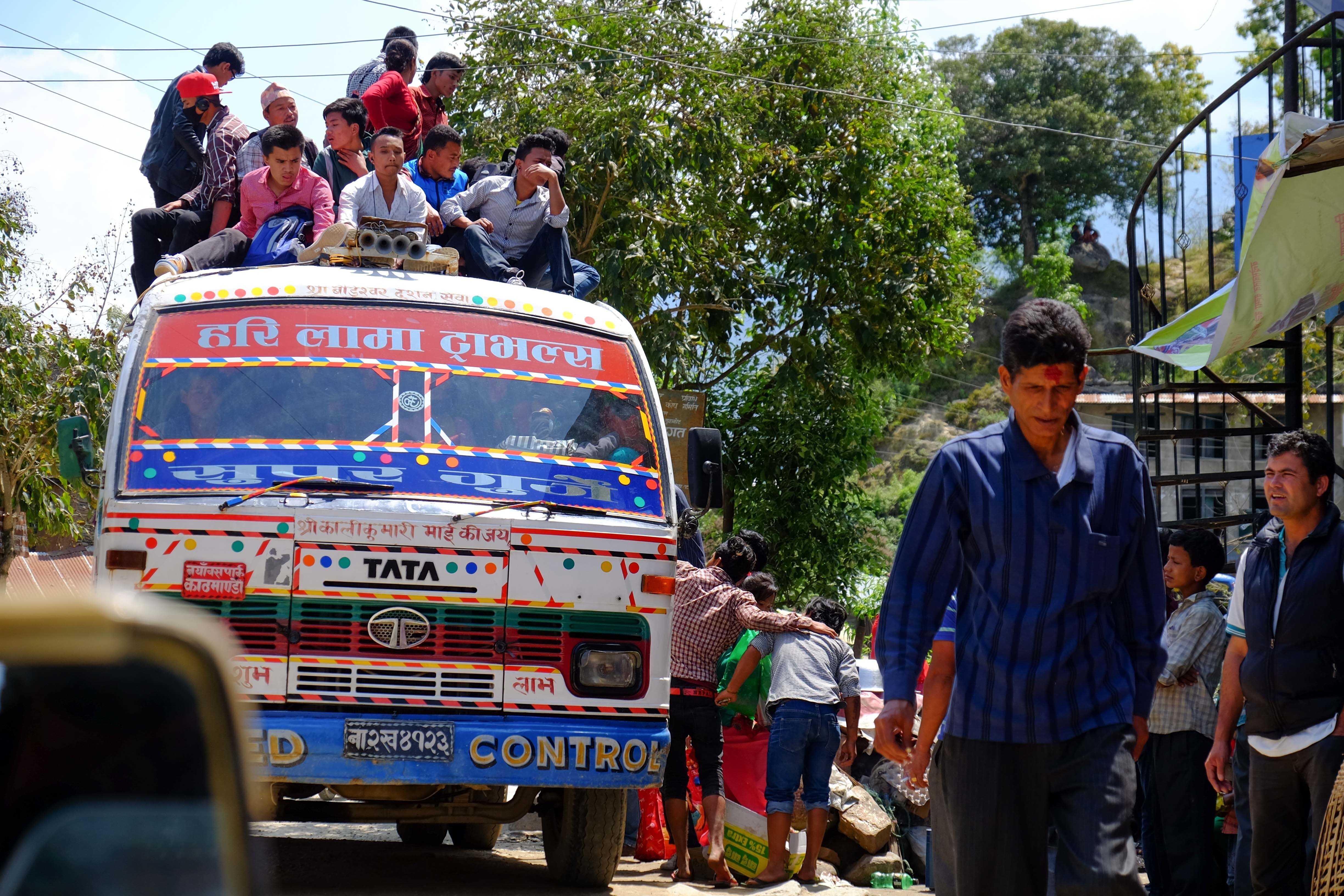 尼泊尔的大客车和印度是一个路数的,车身装饰的五彩斑斓,不仅车上坐满了人,车顶上更是。他们在车顶上如何保持平衡呢,这是个问题。就是给外国旅行者坐的吉普车,包括司机也挤了10个人进去,车顶上虽然不坐人,也装满了行李。