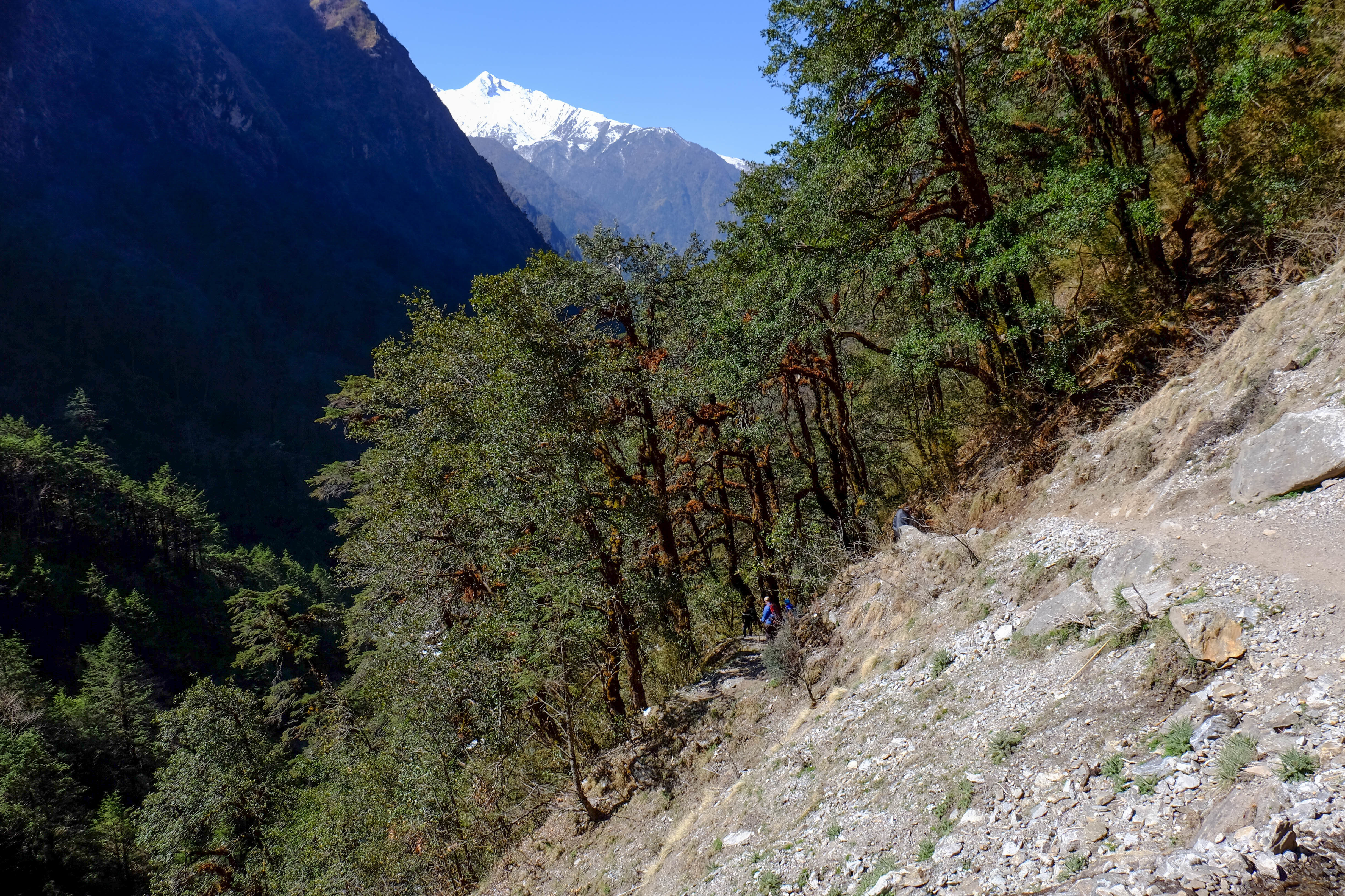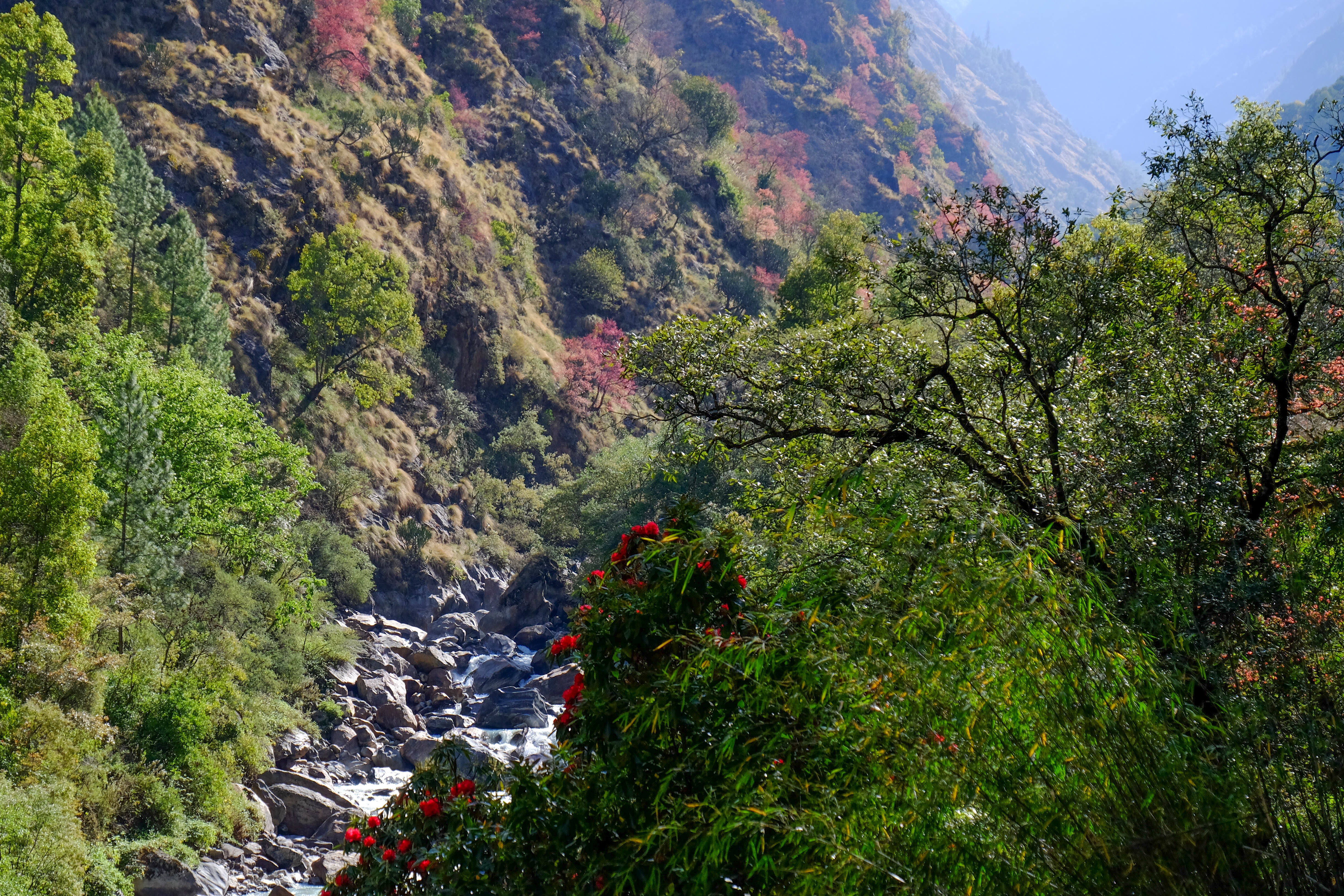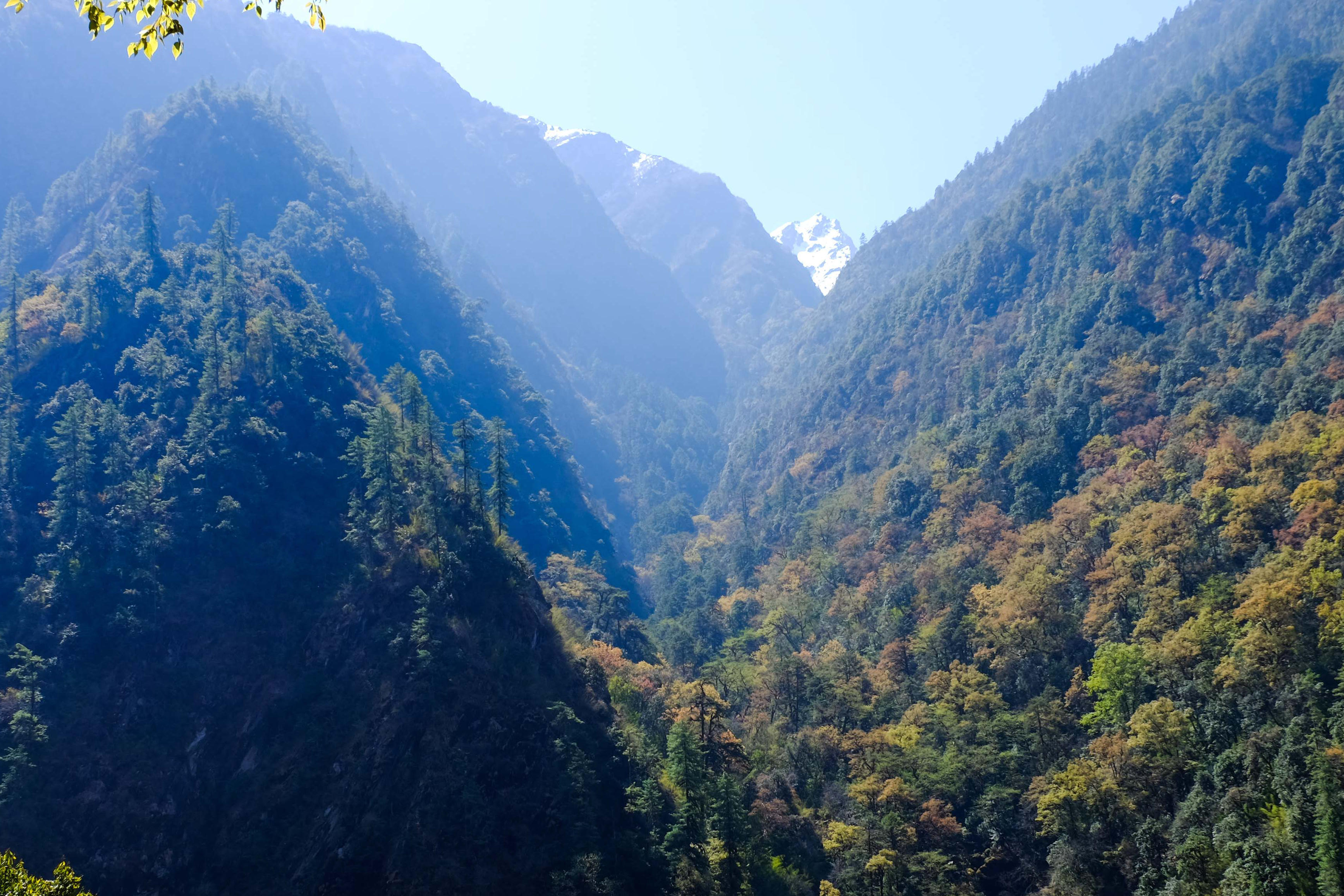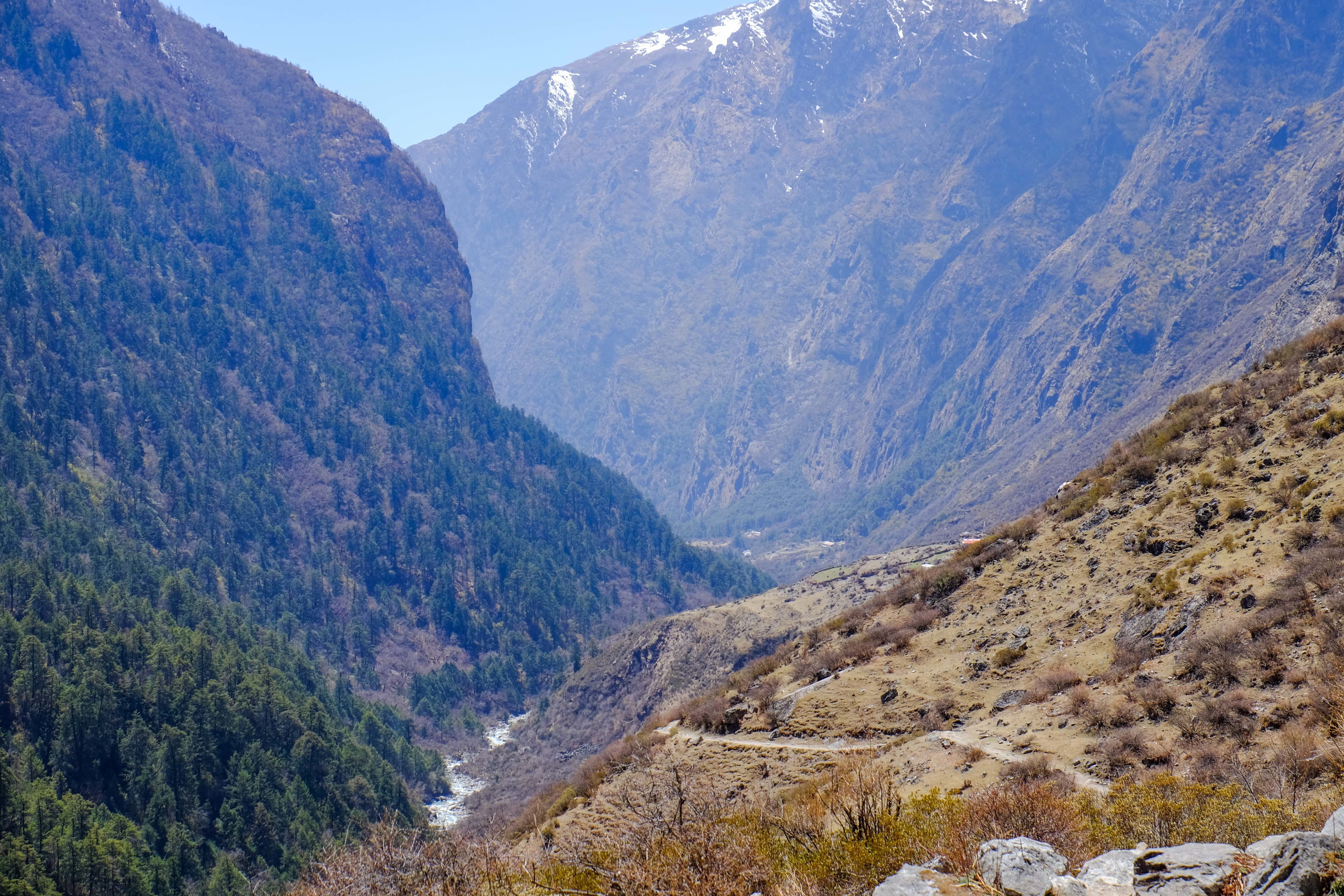 蓝塘徒步基本是沿着山谷里的河(Bhote Koshi)逆流而上,一路上可以看到幽静密林,湍急山涧。河水的轰鸣声不绝于耳,一路上都听得到,甚至晚上在客栈睡觉也能听见河水的奔腾之声。