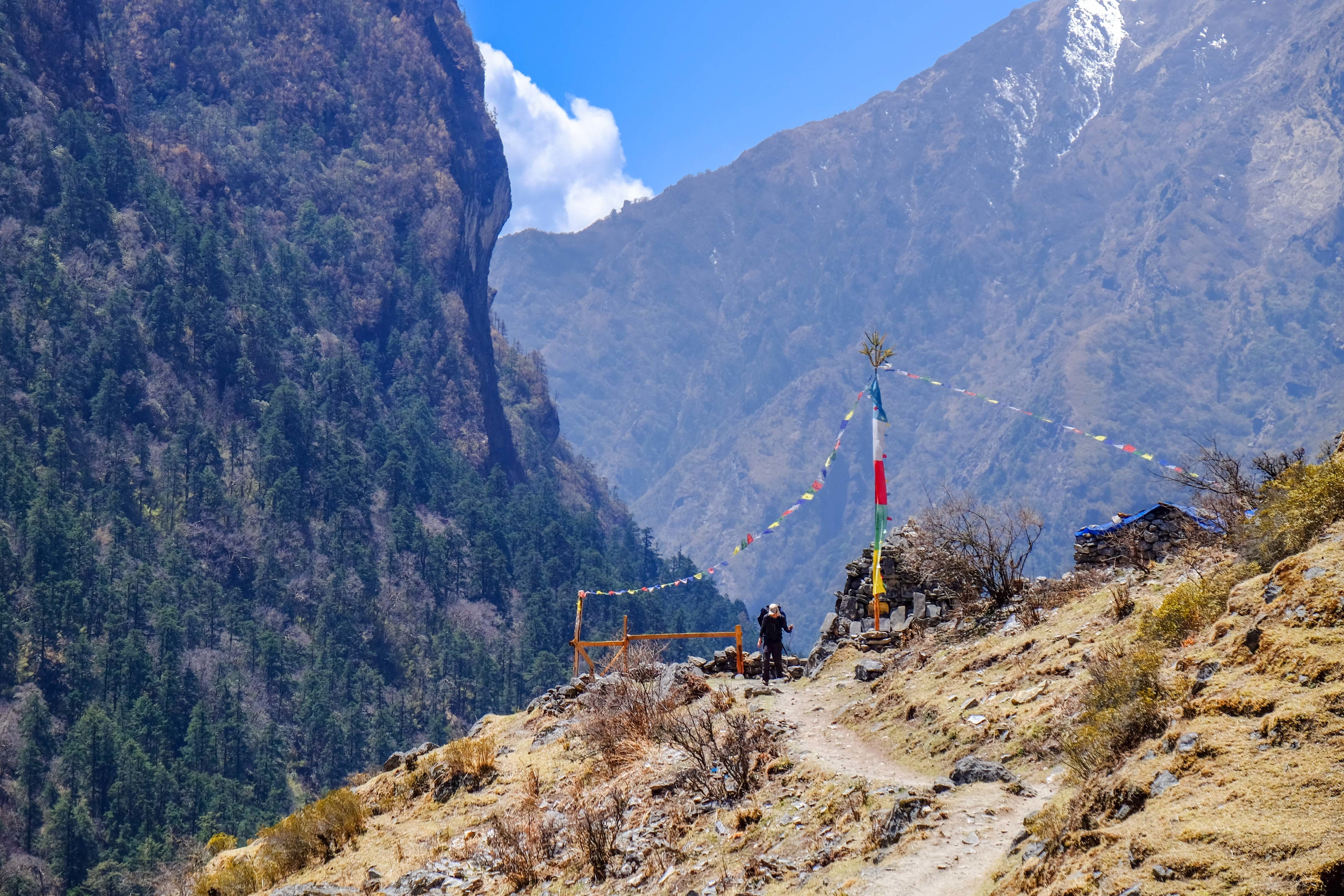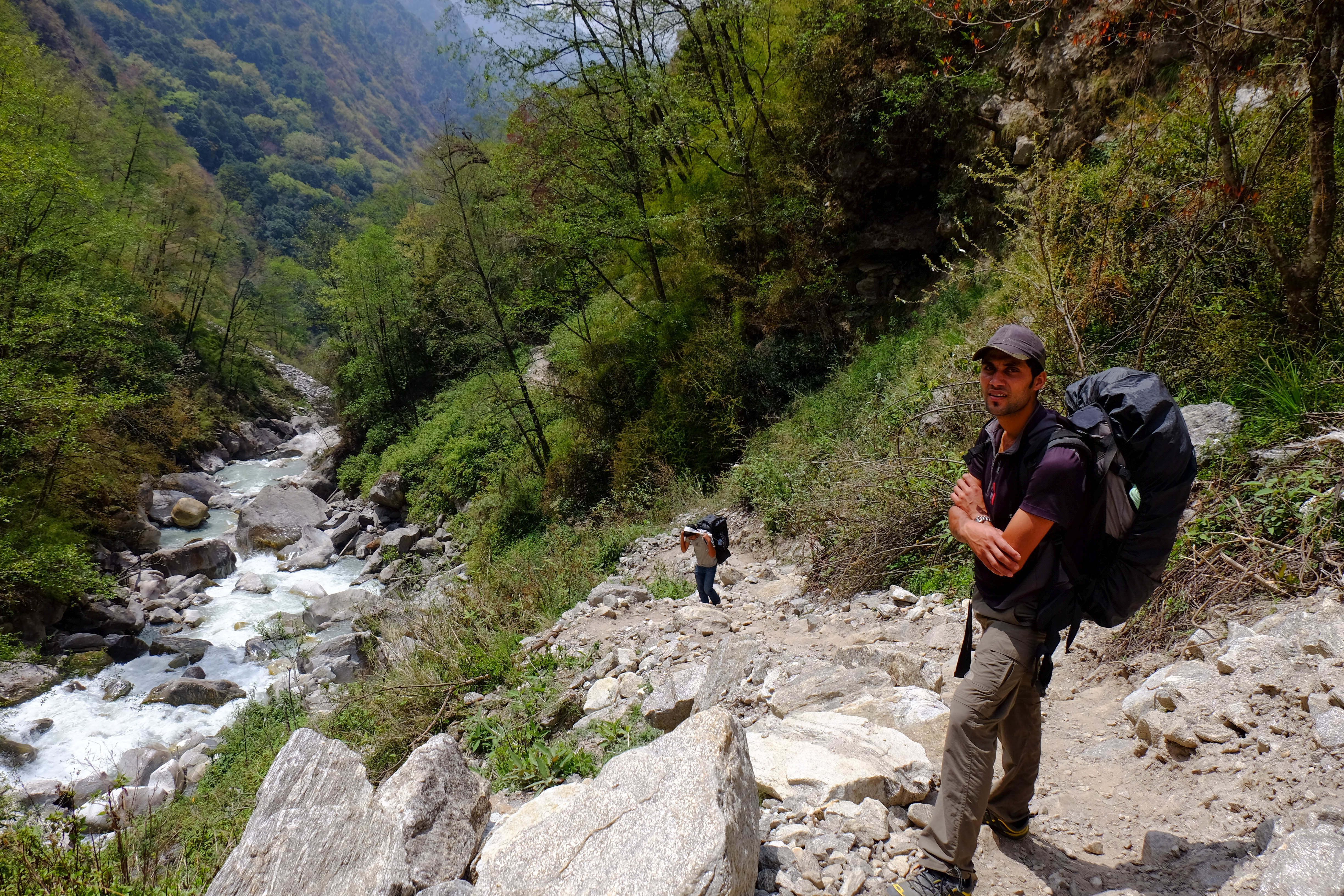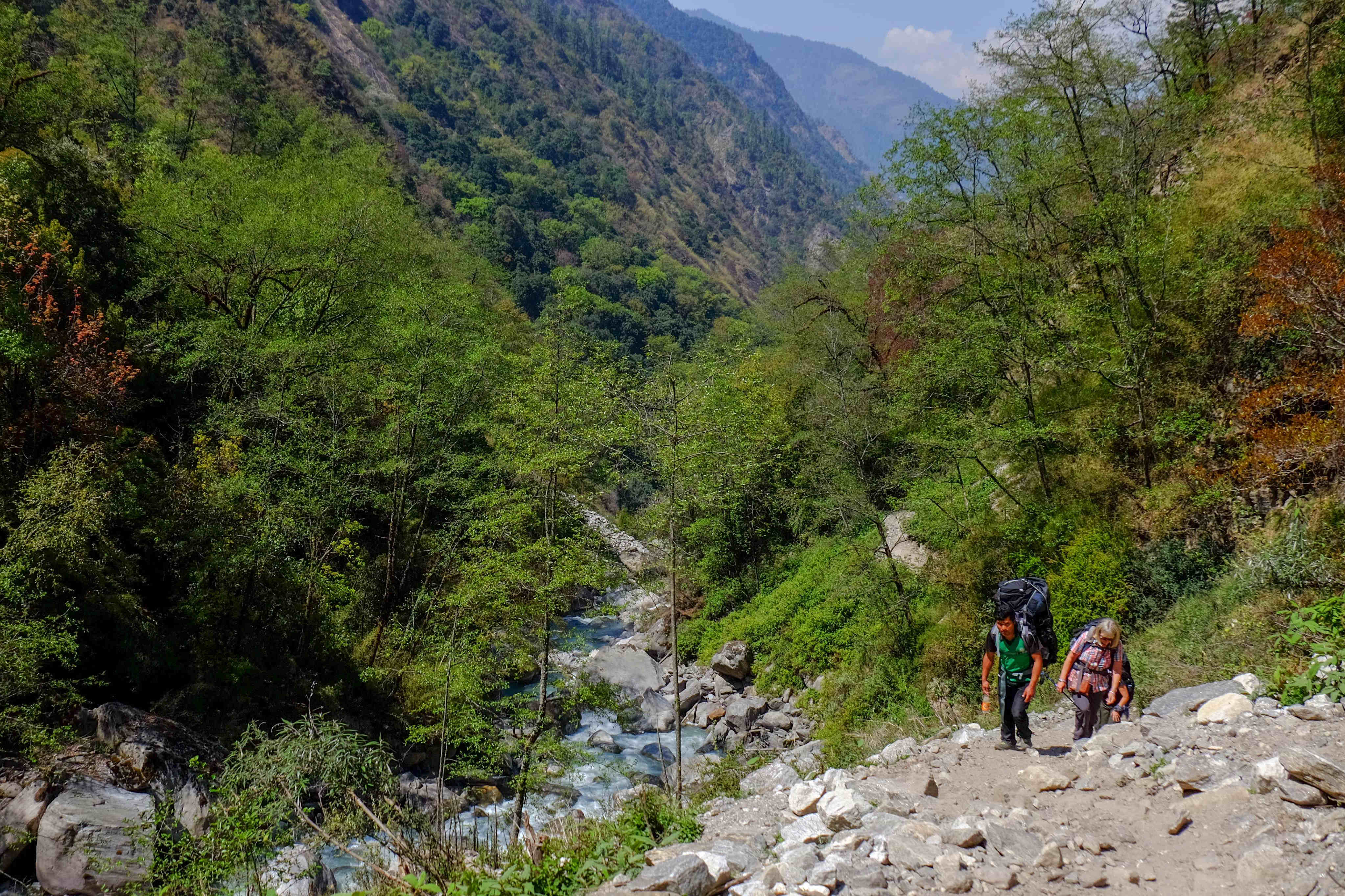 蓝塘徒步基本是沿着山谷里的河(Bhote Koshi)逆流而上,一路上可以看到幽静密林,湍急山涧。河水的轰鸣声不绝于耳,一路上都听得到,甚至晚上在客栈睡觉也能听见河水的奔腾之声。