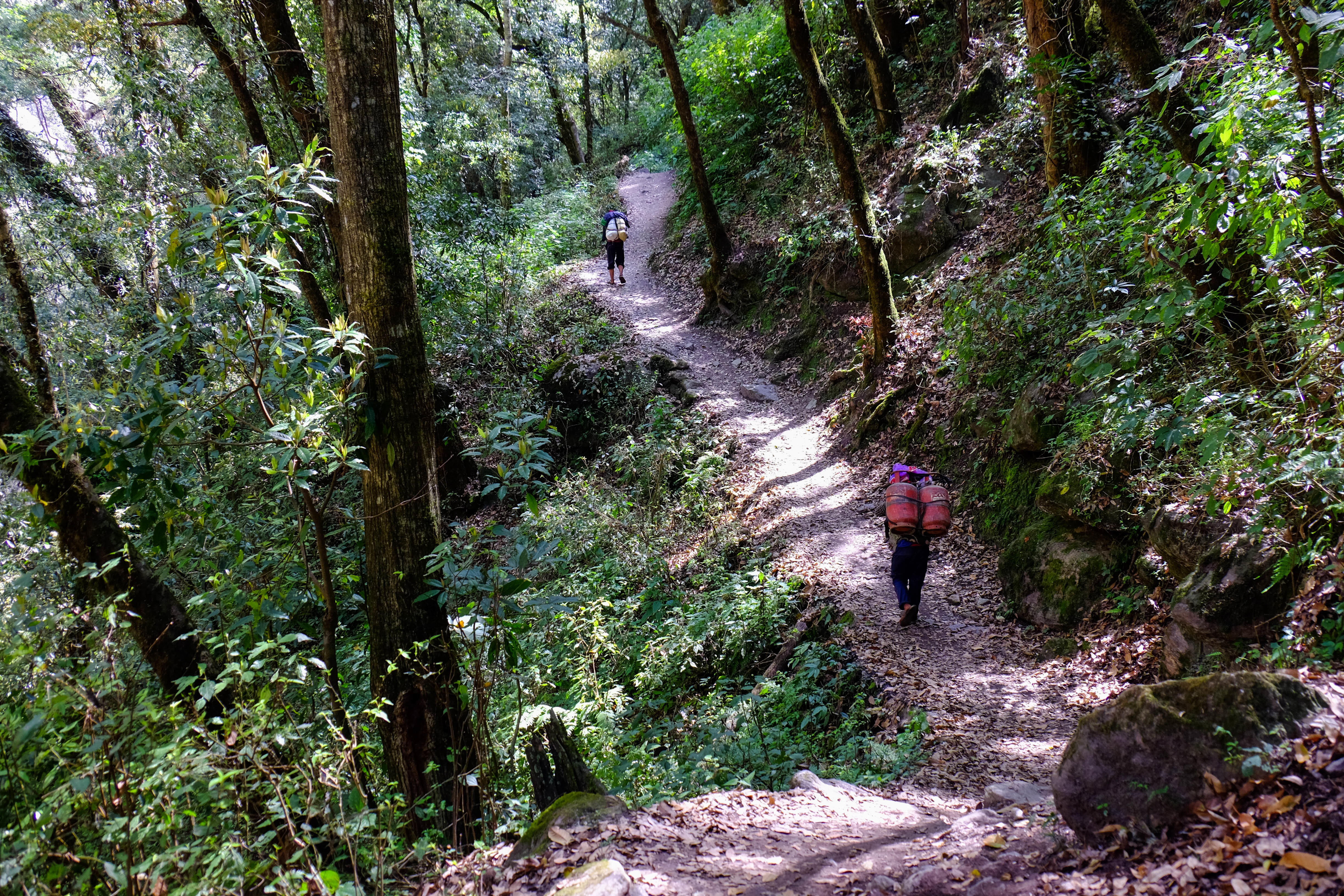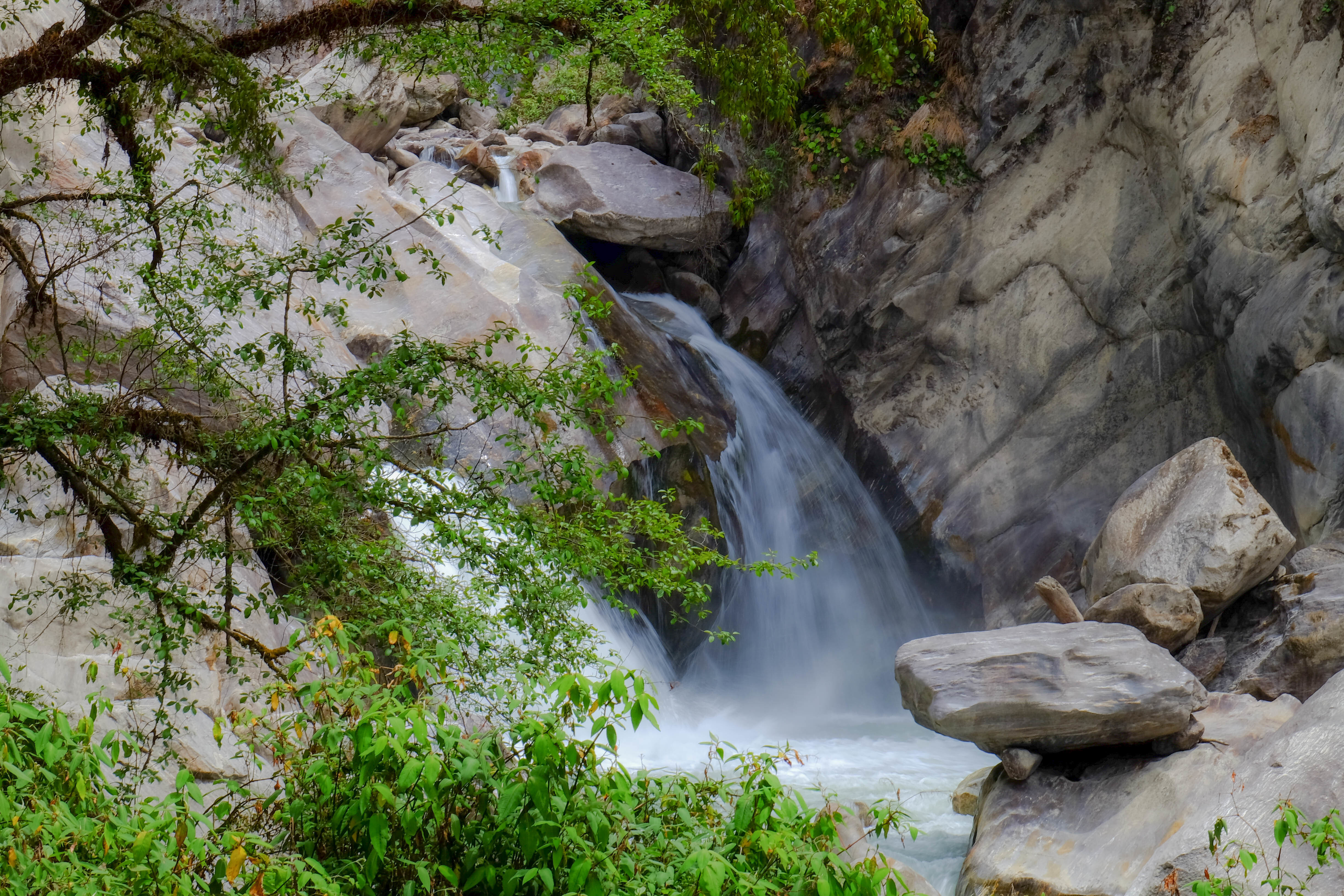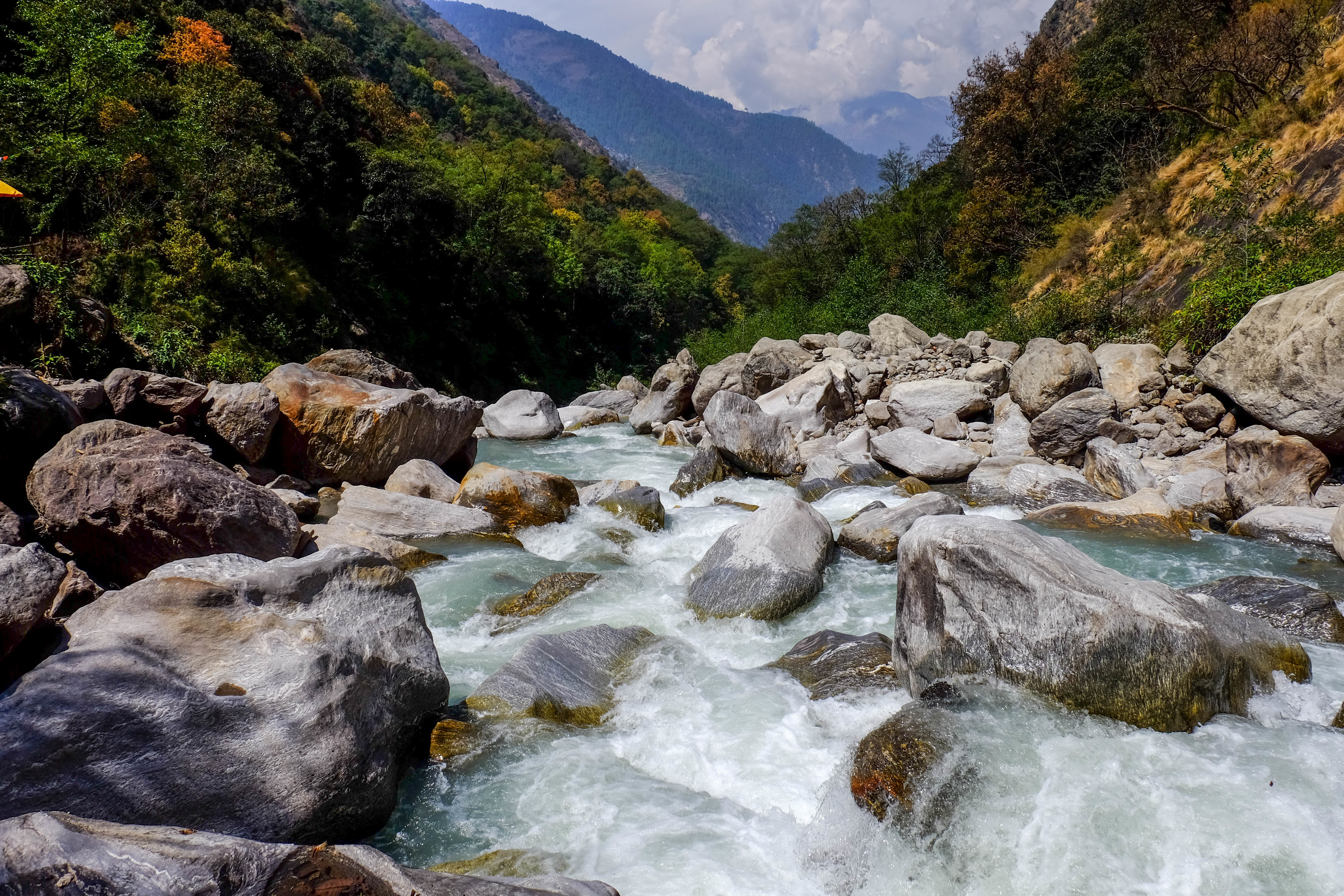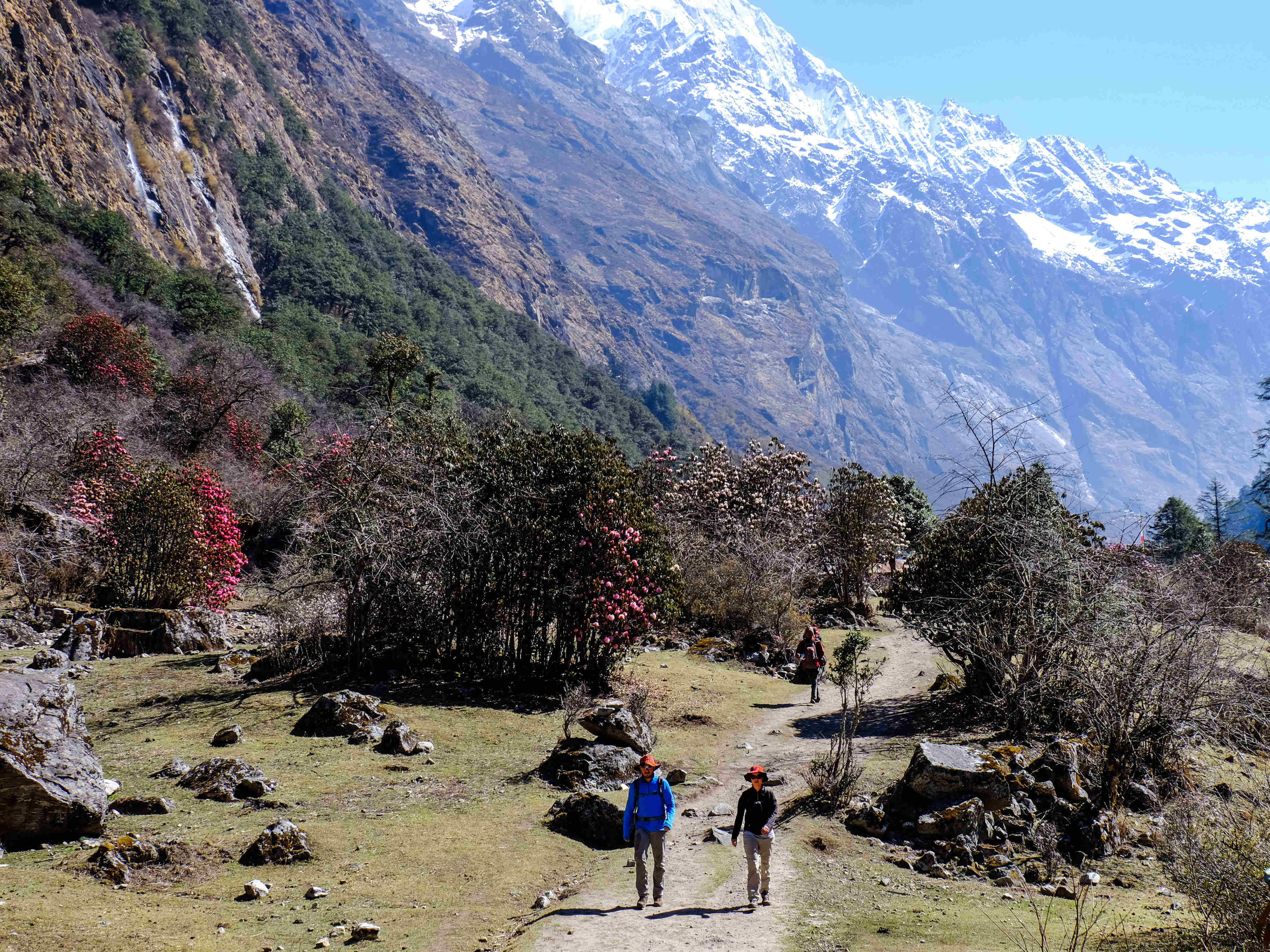 蓝塘徒步基本是沿着山谷里的河(Bhote Koshi)逆流而上,一路上可以看到幽静密林,湍急山涧。河水的轰鸣声不绝于耳,一路上都听得到,甚至晚上在客栈睡觉也能听见河水的奔腾之声。