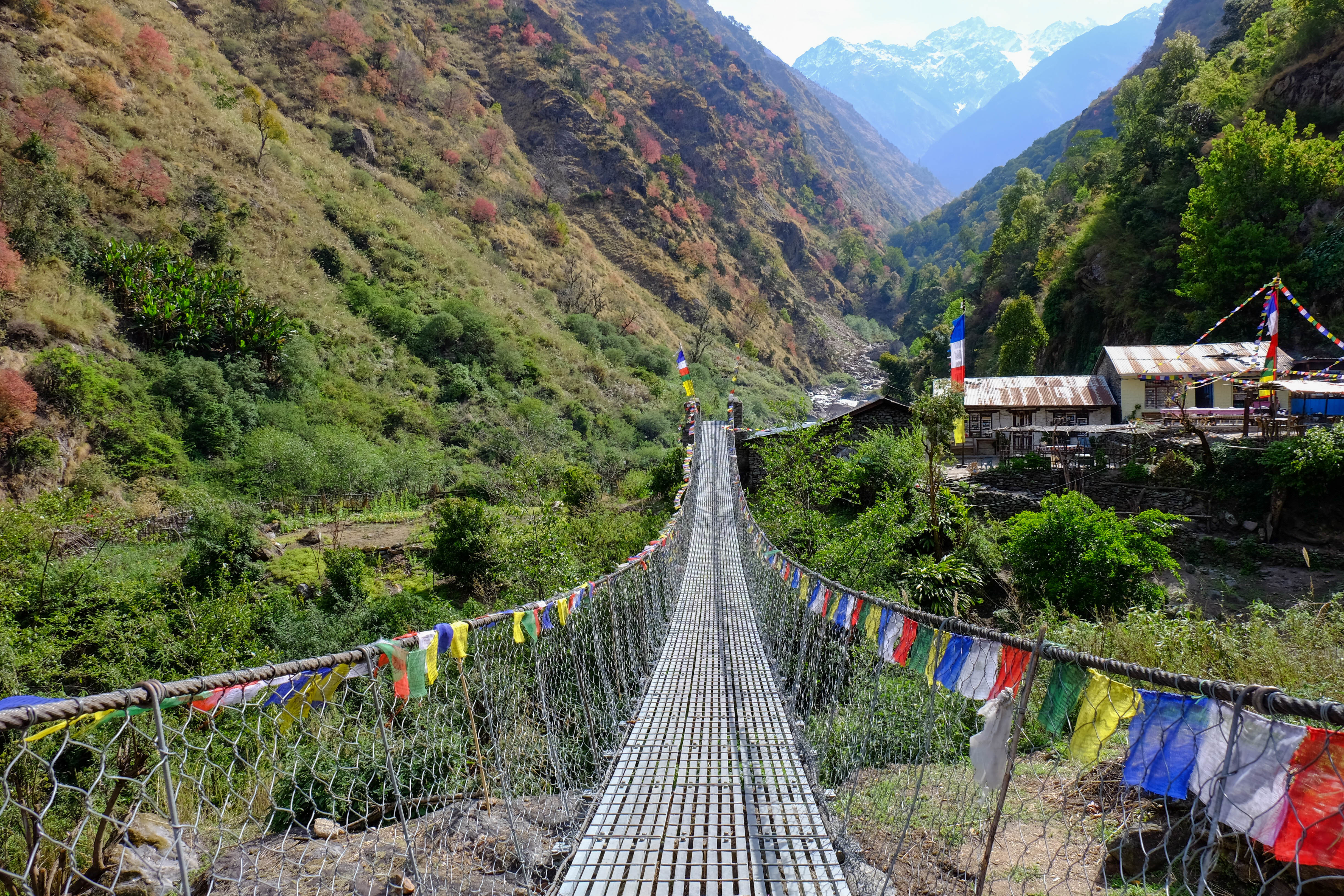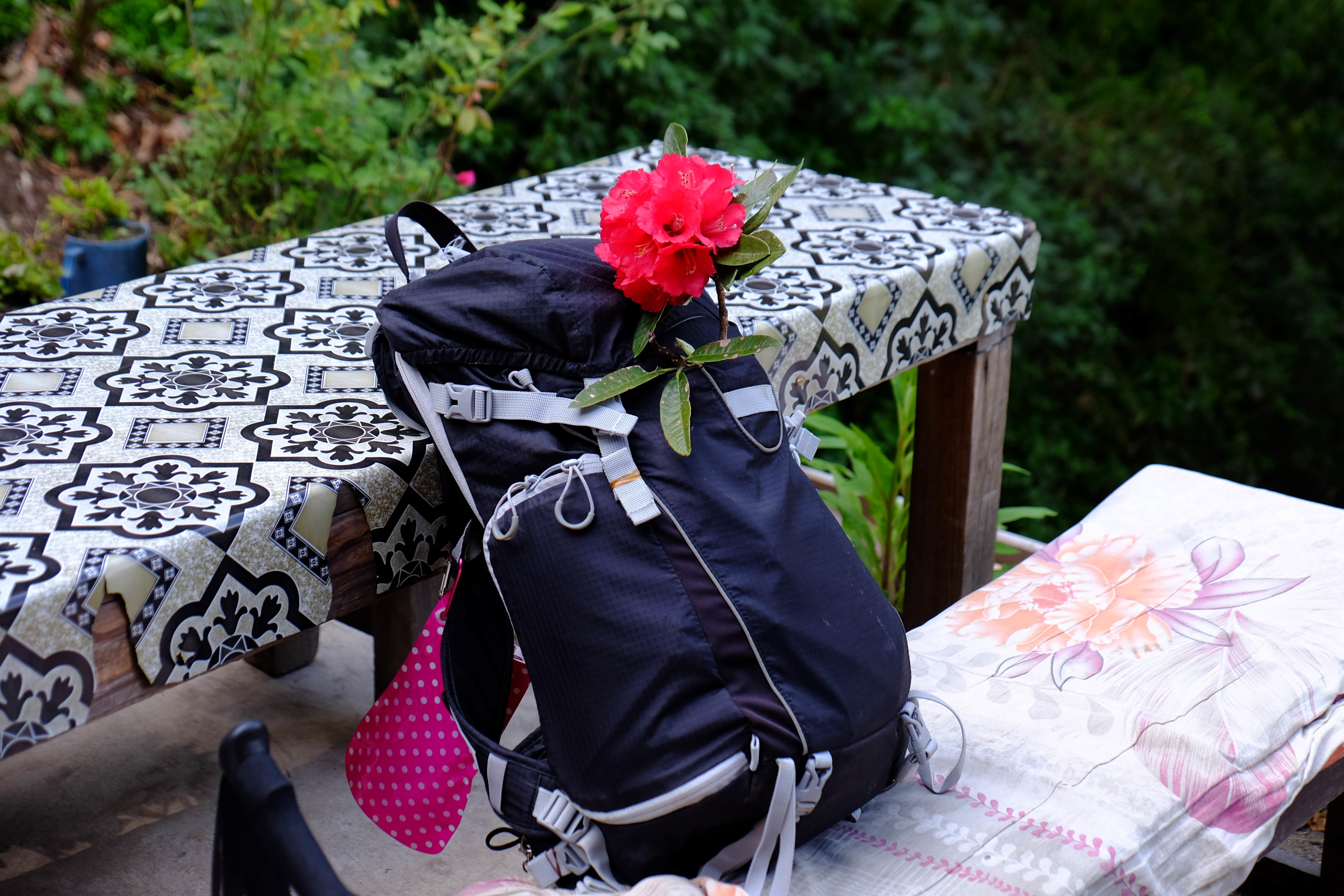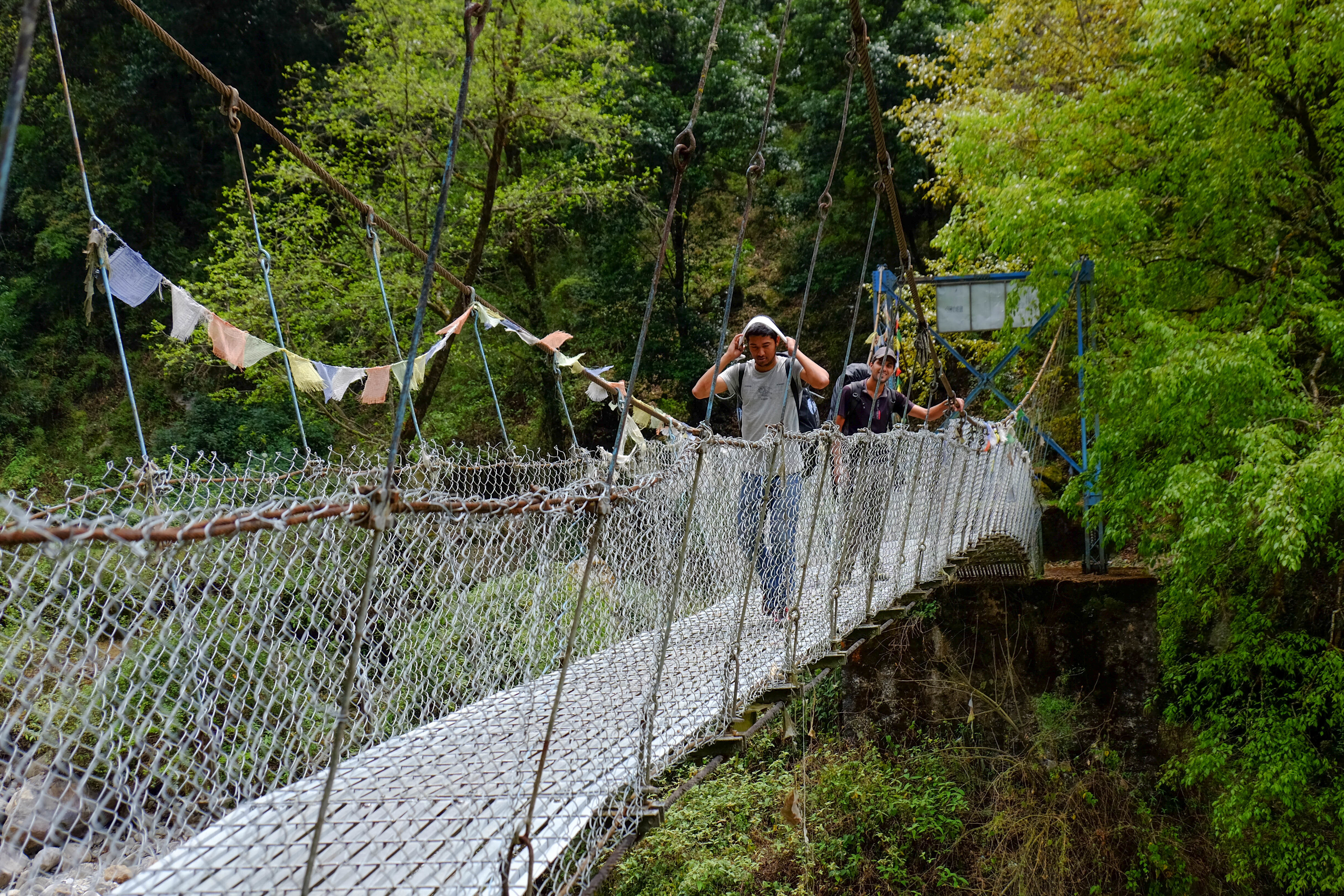 过吊桥时与几个徒步的尼泊尔小伙子狭路相逢,他们送给我一朵红色杜鹃花,别在背包上。这个背包跟了我好几年了,走了不少地方,秘鲁尼泊尔西藏,可谓劳苦功高。