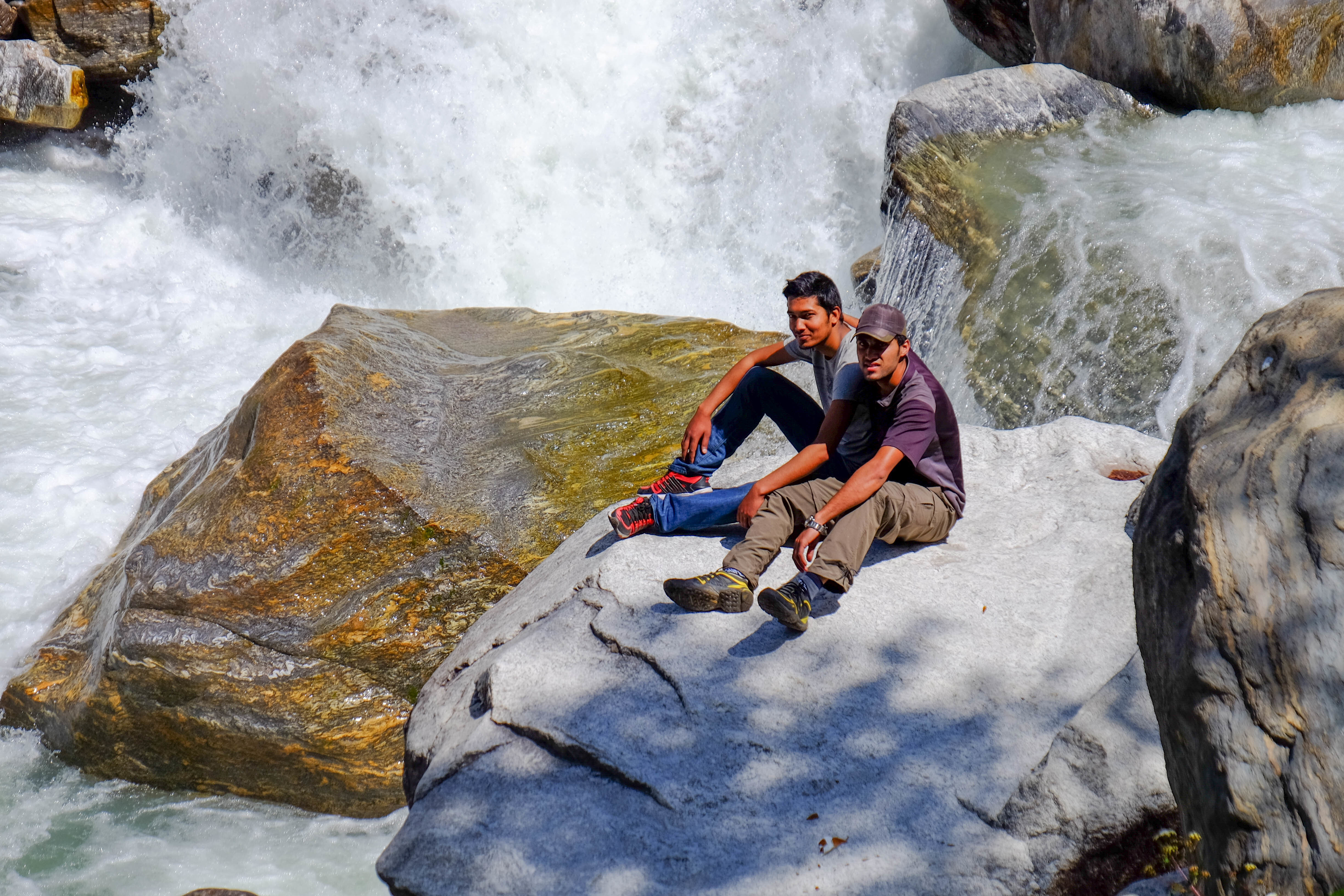 等午饭的时候,我的向导西塔和挑夫阿俊在河里的大石头上跳来跳去,像两只轻快的小鹿。一些单身徒步者就只请一位向导兼挑夫,我经过考虑,还是决定向导挑夫各请一位。三个人关系比较好平衡,而且如果我高反严重,他俩没准儿可以轮着背我下山呢。
