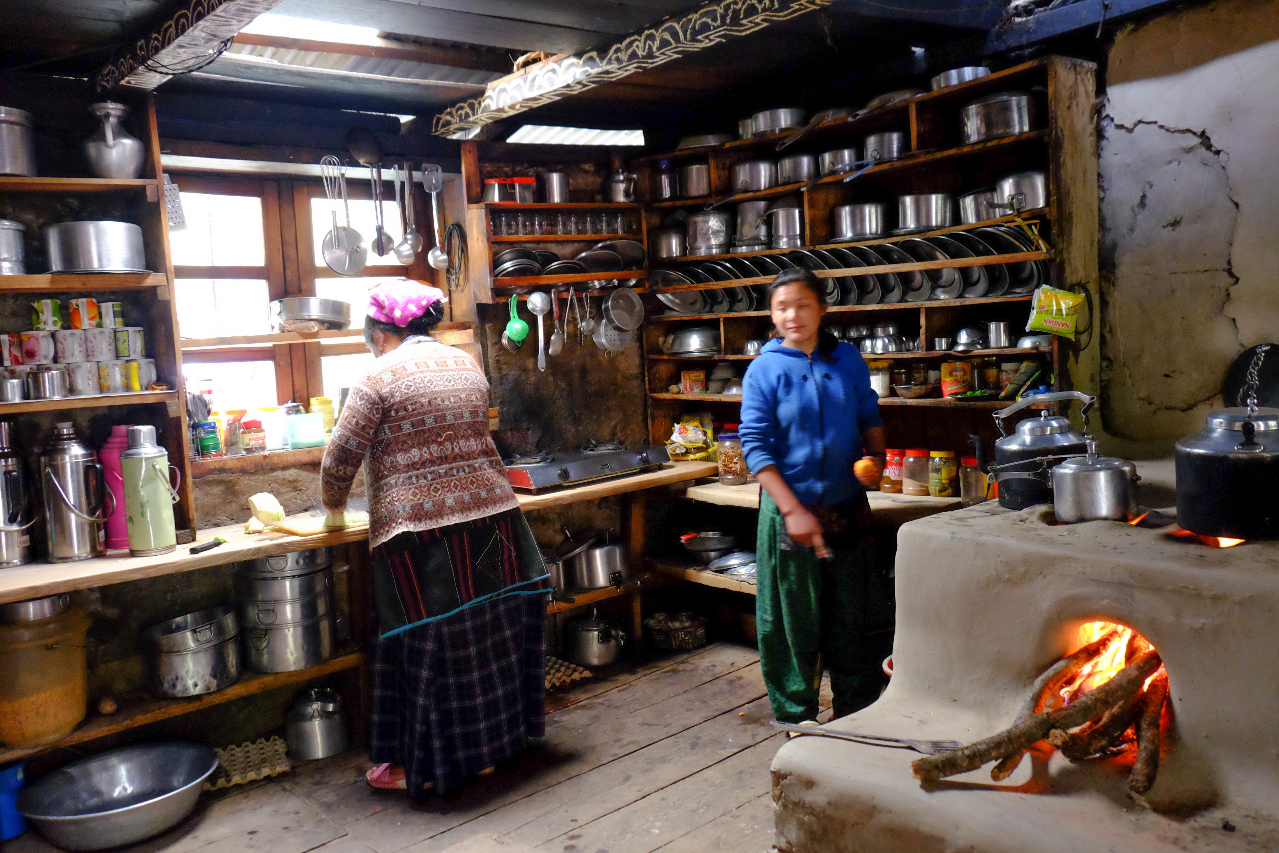 客栈的厨房干净而整洁。连着厨房的是大饭堂,也是起居间。挑夫和向导通常是没有自己的房间的,他们几十个人都挤在饭堂里过夜,好处是人多晚上不冷。