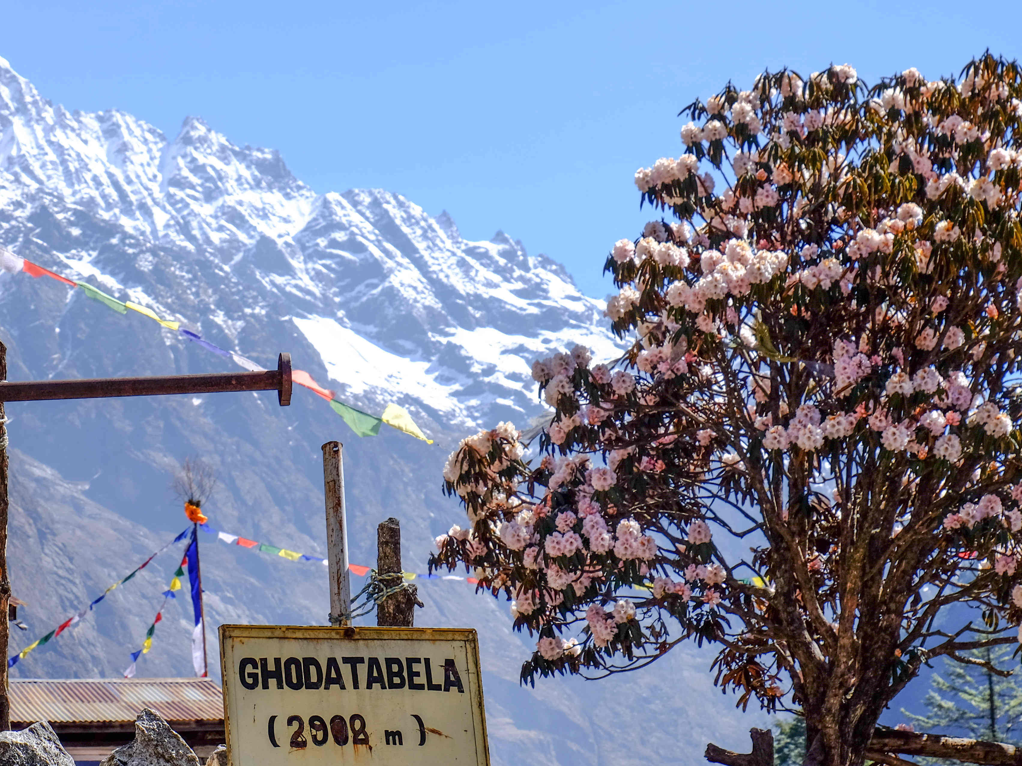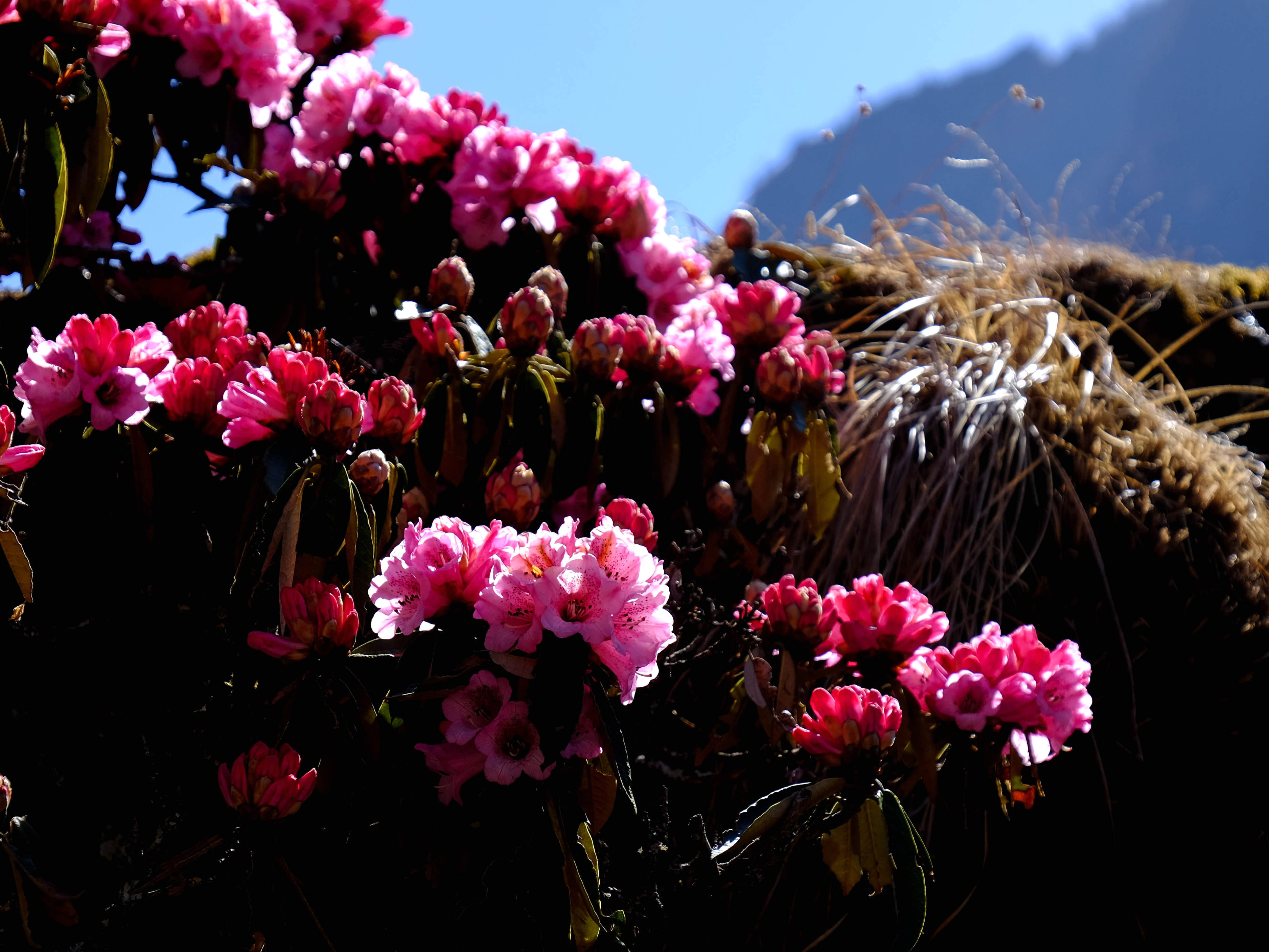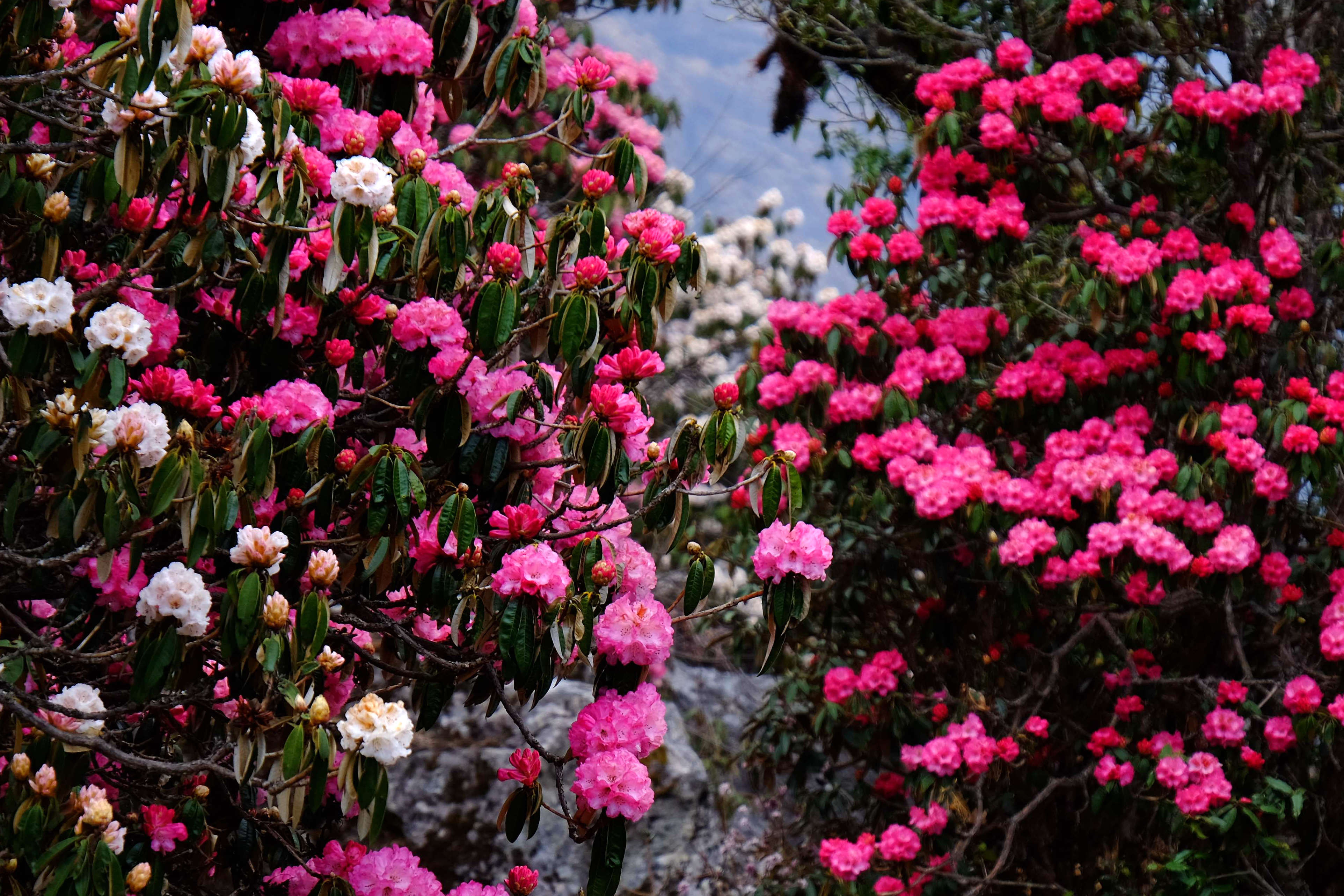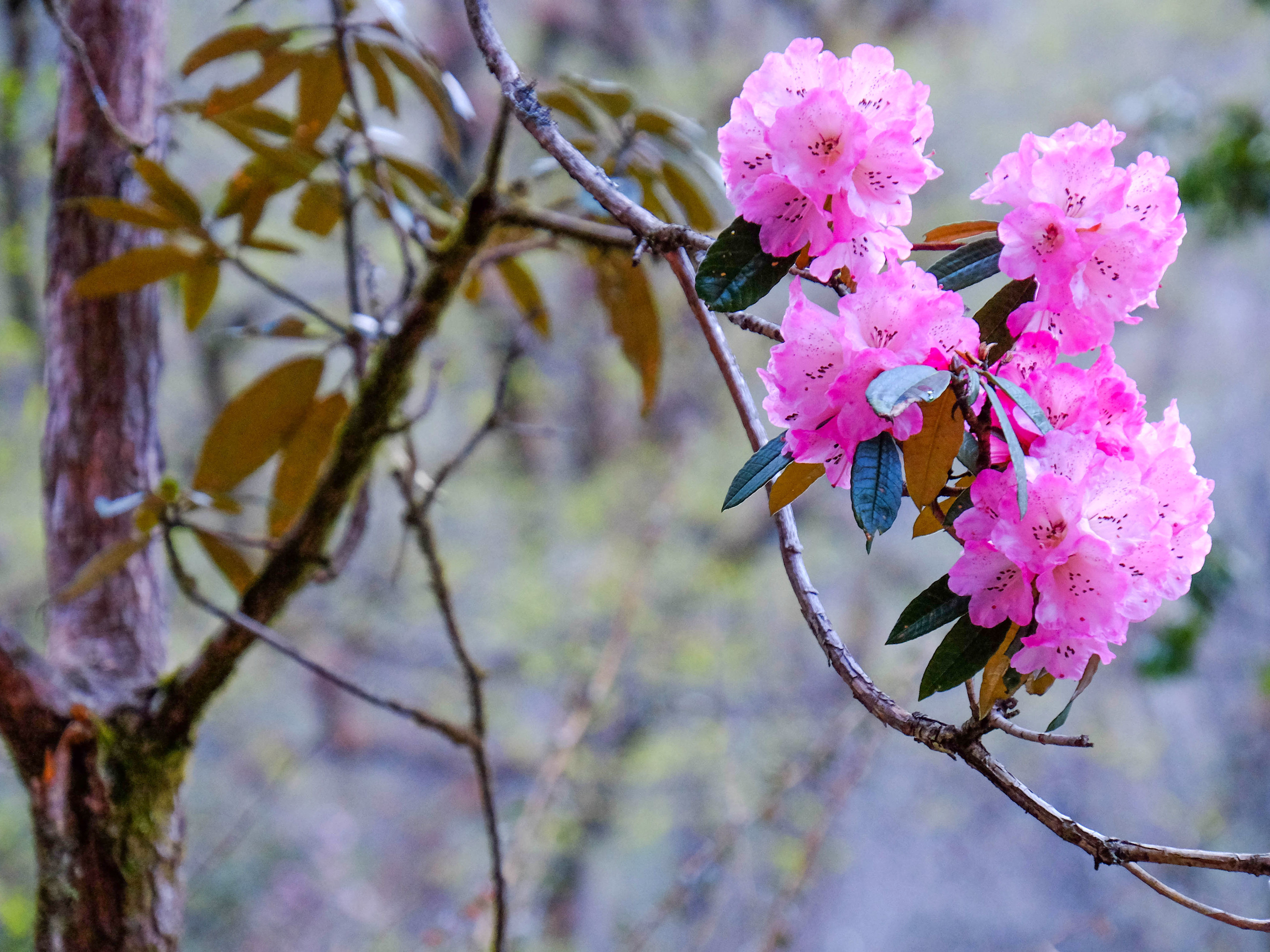 这次选择4月份在蓝塘徒步,原因之一就是很想看看雪山下的杜鹃花,可惜蓝塘的杜鹃花没有我期待的多。挑夫阿俊刚从安娜普纳徒步回来,他说那边的杜鹃花开的最好,以红色的居多。他给我看手机上的照片,果然是漫山遍野的红色杜鹃开到极盛。西塔和阿俊一致认为安娜普纳的杜鹃花开的实在太多太过分了。男人啊!