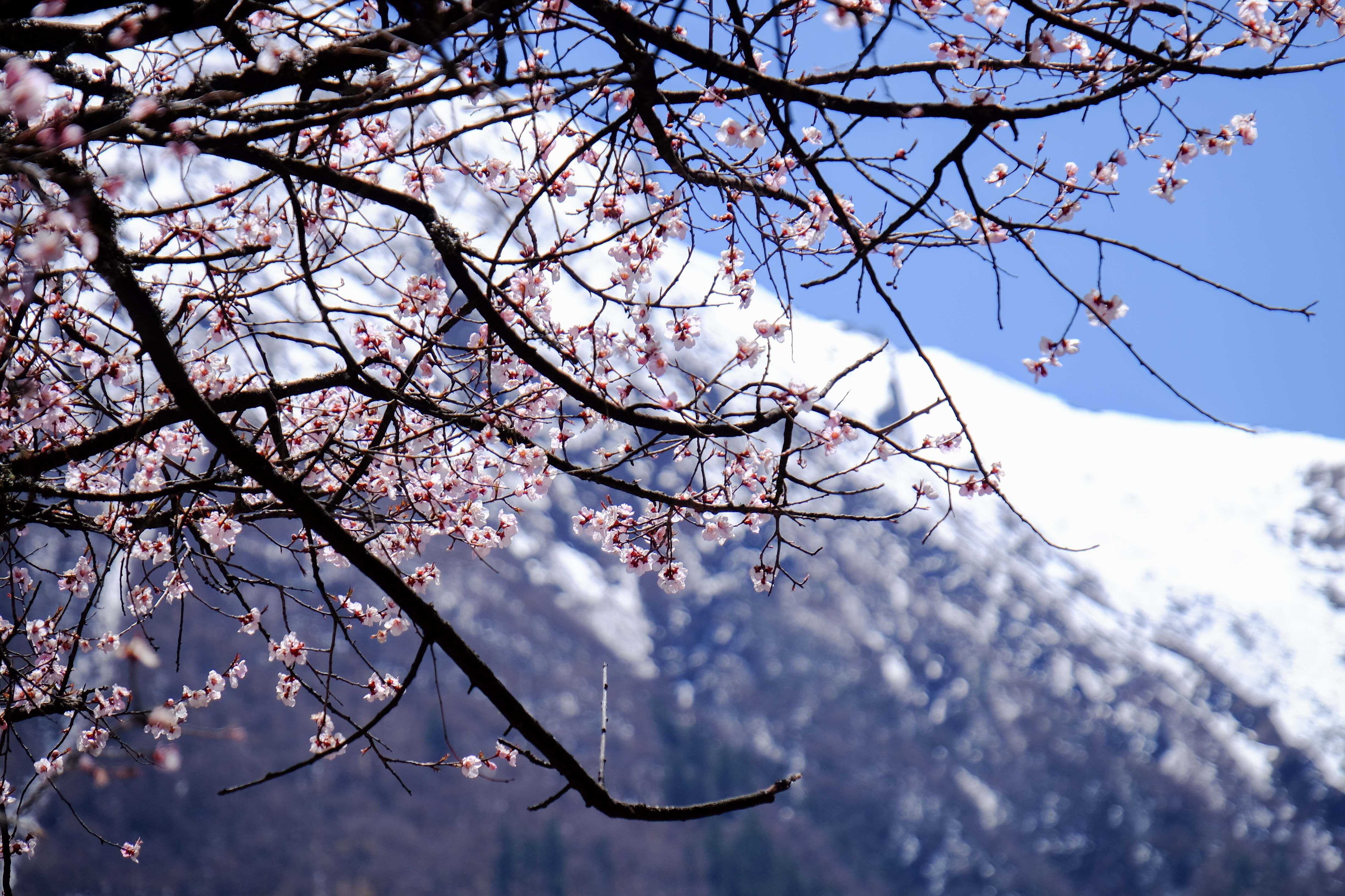 看见雪山下的桃花我很兴奋,上蹿下跳想找个好的角度拍摄,而这桃树是在一个院子里,需要翻墙而过,我终究没有那个本事,悻悻的离去。