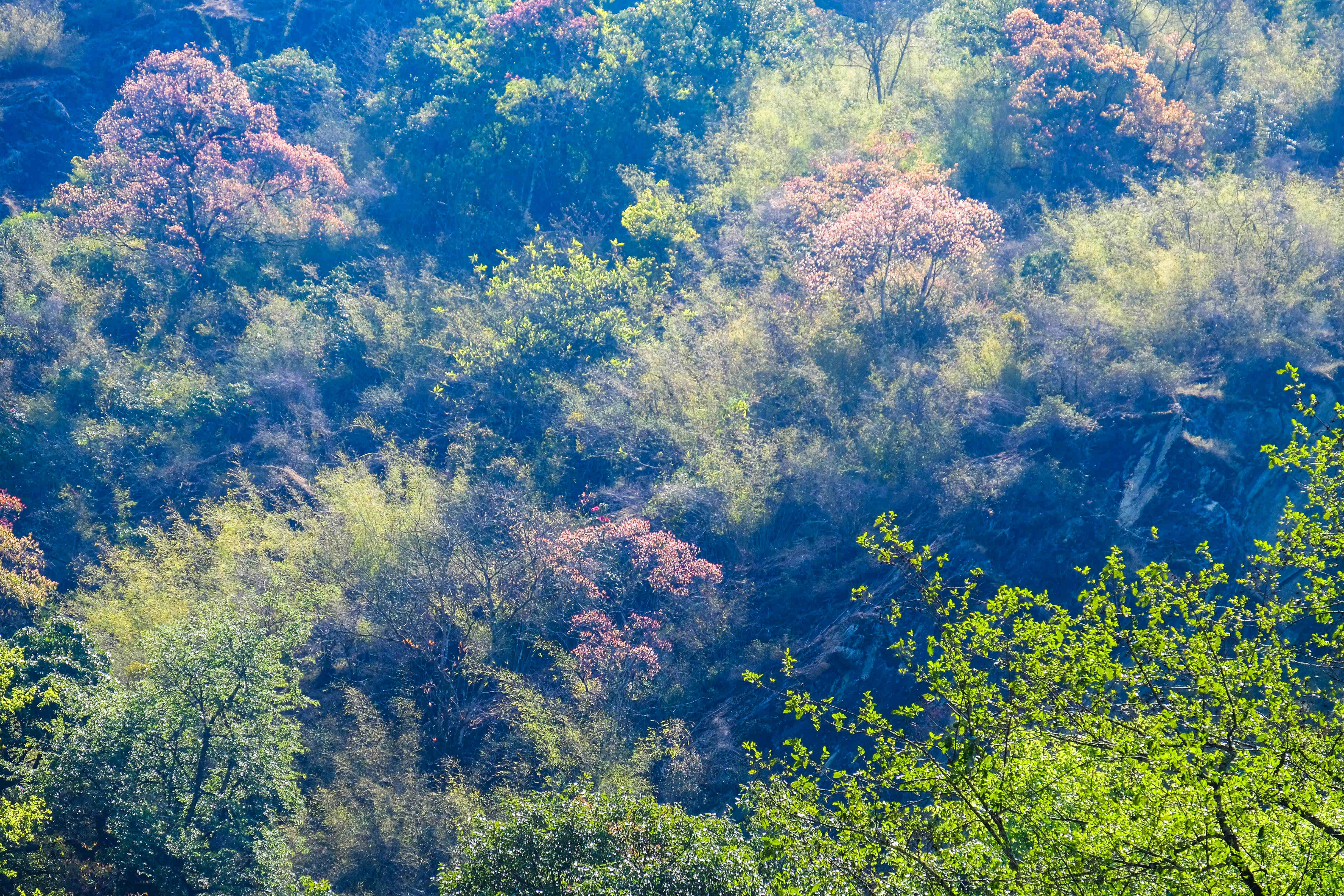 走在清晨的阳光里,看见流动的光芒均匀的分布在密林里和它们跳动的光影。山里空气通透,虽然没什么大景,这样的光线还是很令人振奋的。隐隐约约可以看见山涧上方的红色杜鹃花。