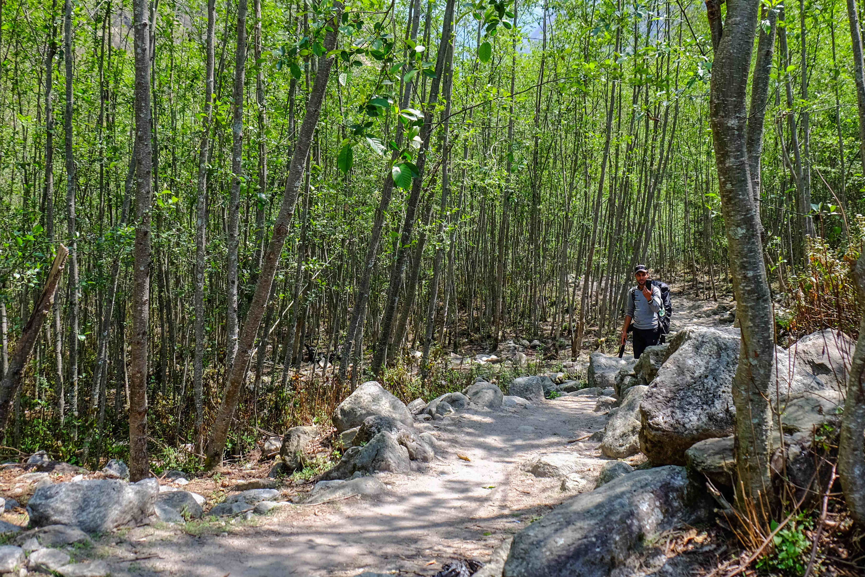 在树林里继续前行,这时的脚步是轻快惬意的,走着我最擅长的上坡路,还是在阴凉的树林里,难度不大。我的向导西塔时不时会提醒我密林里的各种生物,让我惊艳的孔雀蓝的小鸟,长尾巴的白色猴子,还有山崖下的野生蜂窝等,可惜我的镜头不够长也不够快,无法把他们的精彩收入相机里。