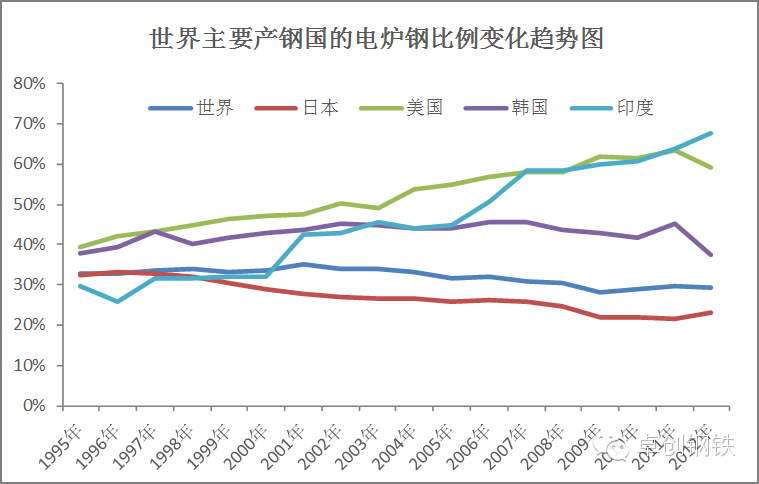 - 世界电炉钢比例逐年提高