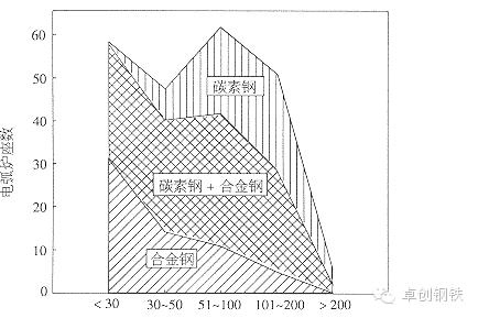 从生产的钢种上看50 t以上的电炉多数用来生产碳素钢,如 51~100 t电弧炉中用来生产合金钢的炉子占18%,101~200