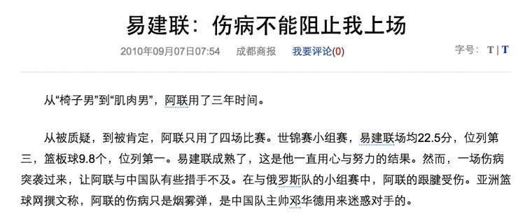首先我们要确定第一个问题,就是2010年世锦赛期间的这个时间跨度,易建联的跟腱炎是在世锦赛正赛期间受伤还是说,是之前的国家热身赛的时候有伤病?我在网上找到一条新闻,大家可以看图!