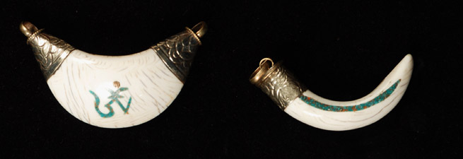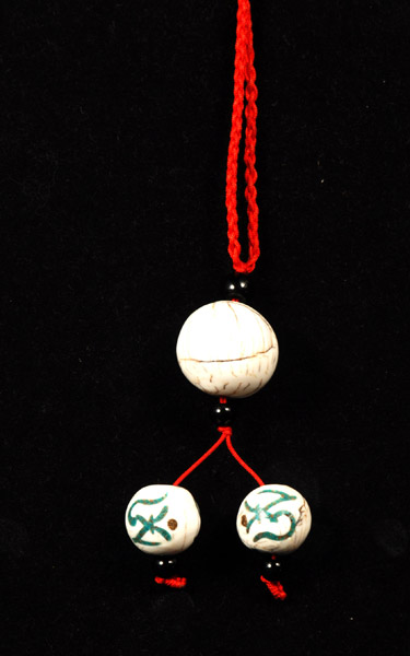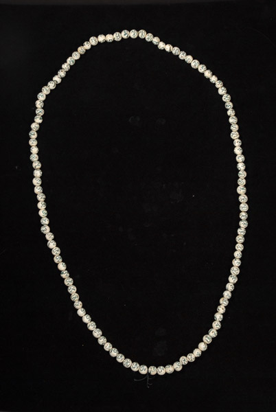 老砗磲镶嵌挂珠:共108颗圆珠为身子,周长160厘米,珠径1、5厘米。在每颗珠子正背两面各开一个图案浅槽、部分孔侧各开一个半月形浅槽,然后将玛瑙粉、绿松石粉和黄金粉嵌入槽内。镶嵌图案实为藏文“六字真言”,是藏传佛教中最尊崇的一句咒语。整串珠大粒饱满、光滑圆润,让人赏心悦目,也给人以神秘感。虽历经百年沧桑,仍显庄重典雅、精光内敛。若将佛头穗配上,确为一串精美绝伦的佛珠精品(见图2)。