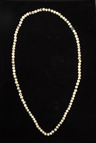 砗磲洁白如玉,质地光洁而细腻,具有珍珠般美丽光泽,是所有贝类中最漂亮、最时尚的装钸品。根据它的颜色、质地、硬度等列为有机宝石类之首,自古以来就受到人们的青眯,也是现代年青人追求的佩饰之一。常见能在手串、项练配上老砗磲挂饰而感到自豪,日益受到人们的喜爱(图5、图6)。由于砗磲的原料非常不容易取得,老砗磲制品质高量少,其身价急升,因而市场上不可避免会出现有人拿假砗磲甚至人造砗磲来蒙骗收藏爱好者(见图7)。其实只要掌握了下面的“五看”,辨别真假并不难,你也能在那些形形色色、品类繁多的佛珠中慧眼识别出老砗磲,并拥有它那是多么有缘的事。