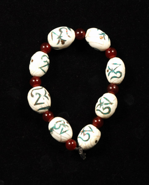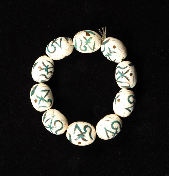 老砗磲镶嵌戴珠,也称佩珠和手串。有8、10颗鼓形珠为身子,周长18厘米,珠长1、8厘米、径1、4厘米。在每颗珠子正背两面镶嵌图案同上挂珠相同(见图3、图4),为藏文“六字真言”。此串佩珠在《收藏界》第77期中甘肃的陈国英等人撰文认为清代砗磲镶嵌手串,“不仅是高僧用来修炼观世音菩萨法门的必要法器,更是藏传佛教视为驱魔避邪的神奇宝物。”故此手串十分精致、珍贵,值得佩带和收藏。