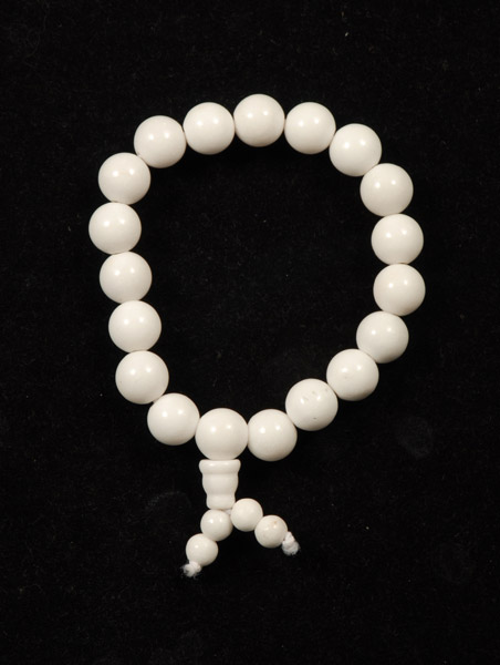 佛珠本称数珠、念珠,是指以线贯穿一定数目的珠粒,于念佛或持咒时,以之记数的随身法器。《数珠功德经》上说:“数珠者,要当须满108颗,如其难得,或54颗,或27,或18颗,亦皆得用。”佛珠按使用方式可分为挂珠、持珠和戴珠。挂珠是挂在颈项的佛珠,一般108粒和54粒;持珠为手掐捻或持念的佛珠,一般18、21、27和36粒;戴珠是戴在手臂、手腕上的佛珠,一般18粒或14粒,因手腕粗细不同也有更少。念珠所用材质种类繁多,部分的材料较为珍贵,且逐渐成为大师、信徒、文人贵族佩戴、玩赏或装饰的物件。大体说来,念珠常见的材料有玉、翠、瓷、水晶、碧玺、玛瑙、珊瑚、蜜蜡、绿松石、青金石、砗磲和竹、木、牙、角等均可制成佛珠。在佛教界中,砗磲深受大师及信徒们的喜爱,除颜色漂亮可作装饰外,配戴在身上也于避邪保平安。佛珠有不同的颗数是因为具有不同的含义。108颗是最为常见的数目,是为了表示求证108种无量三昧,而断除108种烦恼,从而使身心能达到一个寂静的状态。清代官服特有的一种配饰物即朝珠,是由佛念珠衍化而来。朝珠的各部分构成是有特定寓意的。一般认为,总数为108粒宝珠,代表12个月、24节气、72候;而4个佛头代表了“春、夏、秋、冬”四季;背云则寓意“一元复始”;3串记捻表示一个月里的上、中、下三旬,总和为30天。按清制,只有文职五品、武职四品以上的官员上朝时才能配挂朝珠,历来被达官贵人富豪之辈视为珍物。朝珠与佛珠二者最大的区别在于:朝珠将佛头穗的样式改成了由阔丝带系缀的用银丝珐琅裹着的被称作“背云”的大坠子。