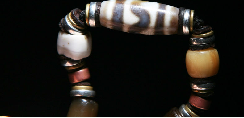 一、天珠是经由人工处理过的镶蚀玉髓,则以白色(铅化合物)的图案线条所绘制而成。制造方法,可分为赤珠(涂以氧化铁)与黑珠(密波蓝果实中摄取的染料)两种。