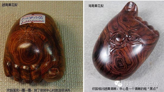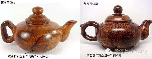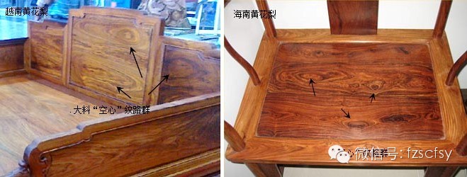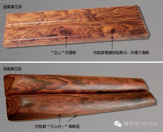 微凹黄檀是目前市场上最多的被用来冒充交趾黄檀的木材,由于两种木材在纹理和密度油性上的相近,加之不良商家后期作色,普通消费者很难辨别真伪。然而,仔细观察亦能发现两者的不同之处:
