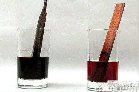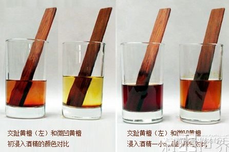 对两者进行酒精浸泡测试可见,交趾黄檀的酒精溶液呈橘红色,而巴里黄檀呈紫褐色至黑褐色,相比外观,这种化学反应上的变化可称得上这两种木材最为明显的区别。