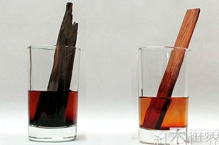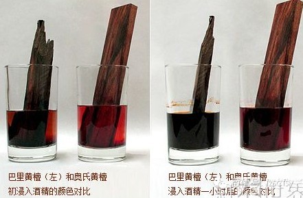 酒精浸泡测试。奥氏黄檀和巴里黄檀的酒精浸出液颜色差距较大,经过一个多小时的浸泡,奥氏黄檀的酒精浸出液为红色,而巴里黄檀则为黑褐色,颜色明显深于奥氏黄檀。
