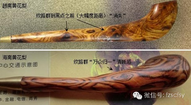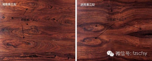 交趾黄檀的黑色条纹(俗称“黑筋”)绵长且深而重,巴里黄檀条纹不连贯且浅而细;