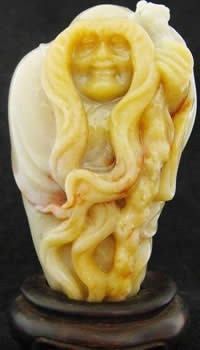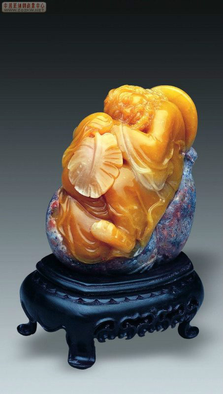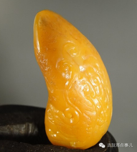 黄旗降石色黄如蜜蜡,根据其浓淡深浅,称为“秋葵蜜蜡“、“柑黄蜜蜡”和“蜜杨梅”等。偶见黄中带红、白各色,色界分明,是巧色石雕的首选石材之一。