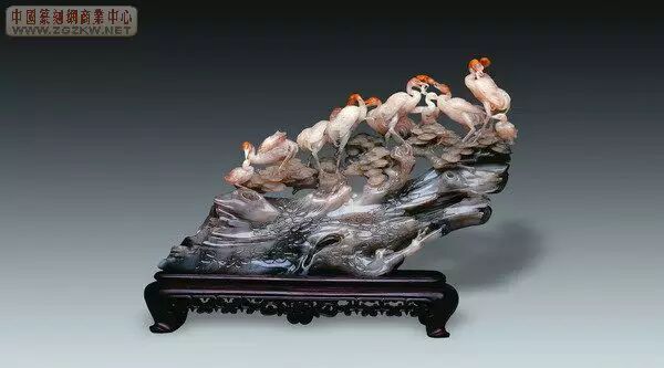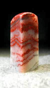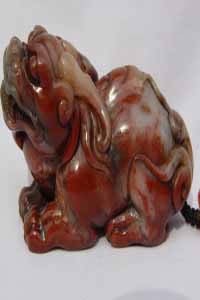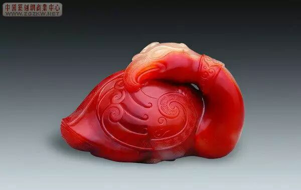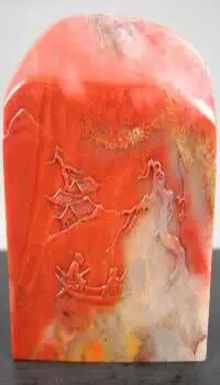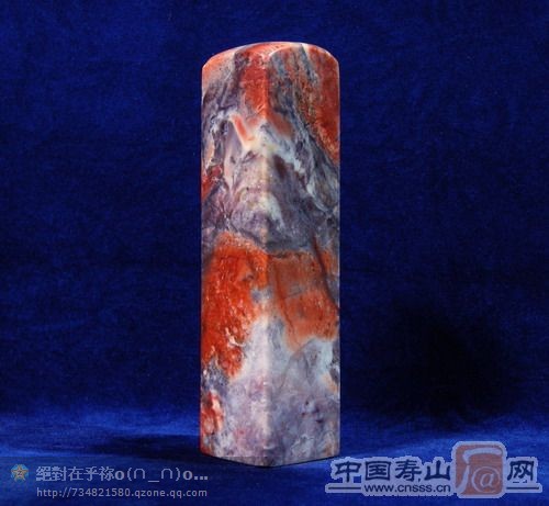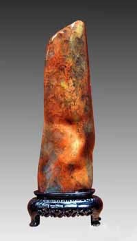 红旗降石 以其色的浓、淡分为李红旗降石、橘红旗降石、玛瑙红旗降石、珊瑚红旗降石和赭红旗降石数种。颜色艳丽照人,光彩夺目。