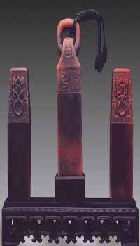 传说中田黄是乾隆皇帝做梦时玉皇大帝赏赐的宝贝。田黄由于其稀缺性和独特的艺术魅力,在很久以前便已经掀起盛极一时的玩赏之风。在清代帝王的眼里,田黄的地位超过一切珍宝,而民间则早已被神化,甚至认为它可以“驱邪辟灾”“延年益寿”。诸多的因素令田黄从中国的众多石品中脱颖而出,被尊为“石帝”。清朝康熙皇帝曾率群臣向一枚硕大圆润的田黄顶礼膜拜,以取年年“福(建)寿(山)田(黄)丰“(收)的吉兆。咸丰皇帝临终前赐给慈禧一枚“同道堂”印章,她可以用这枚印章与皇后同理军国大事。正是这枚印章帮她逐渐掌握权力,登上了中国最高统治者的地位。而这枚非同一般的“同道堂”印章正是一块田黄,这使不可一世的慈禧太后对田黄产生了敬畏之情,从内心感觉到田黄的神奇和通灵。发展到最后,她一见到田黄便沐浴焚香。目空一切的“老佛爷”的这种惊人之举,让珍贵已极的田黄更加身价百倍。以至到后来官场权贵敬石成风,当朝为官的无不以求得一块田黄护官为幸。从此以后,田黄便成了权力的象征。末代皇帝溥仪出逃流亡的时候,随身携带的物品屈指可数,但在逃亡的整个过程中他始终保存着一件田黄“三连章”印玺。