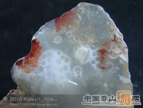 高山环冻石 高山冻石体中隐有环晕者。环多呈粉白色,大小不一,情趣比其它高山冻石更胜一筹。