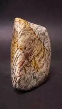 彩虹旗降石 为旗降石的新品种。此石石相奇特,在黄旗降石材上环绕着红色、浓黄色等条纹,酷似彩虹绕穹,实为艳丽奇观。