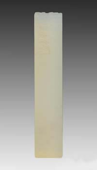 银裹金旗降石 旗降石中有白皮黄心者,称银裹金旗降石。佳者,皮如白高山冻石之凝腻,心似田黄石之细润,色界分明,温柔有加。