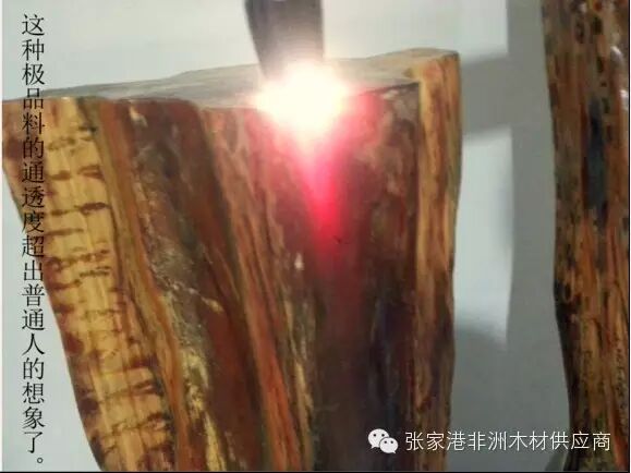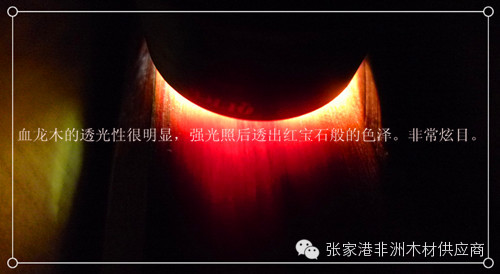 透光性:强光照射下可以象犀牛角一样晶莹通透,这种透光性能是所有木种中唯一独有的。木头透光颠覆了传统对木材的理解,油份足的木料,油格细密连续分布就会产生透光的现象,就像滴过油的纸会变透明。血龙木有明显的荧光反应,这是含丹宁素高的木材都有的特征,这其实也是油份足的原故。血龙木比海黄,越黄,还有很多红木的根部料更明显。