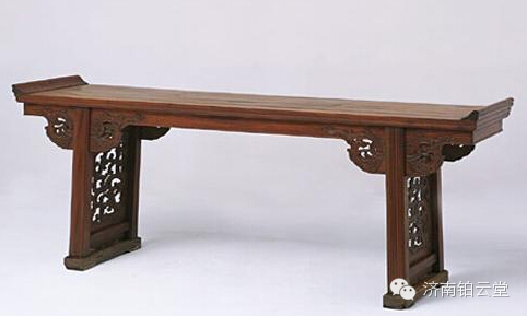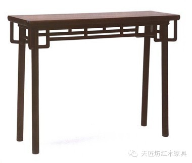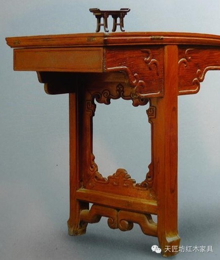 架儿案 为分体式家具,两端是儿子,儿子上架设案面,拆卸十分方便。儿子作二段或三段处理、一般中段镶板,上、下二段透空,并作成各种圈口装饰。以期棚木、红水多见。