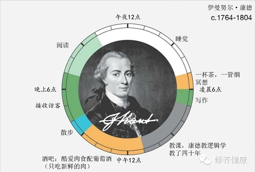 严格遵循时间表的康德,也是早睡早起的模范,晚上 10 点入睡,早上 5 点起床。 写作仅占了一个小时的时间,而上午的重头戏则是教授四个小时的授课,40 年来雷打不动。午间康德去酒吧享用全天唯一的正餐,而下午 4 点到 7 点和挚友约瑟夫·格林 (Joseph Green)的密谈交流,准时得足以让邻居来校准调表。