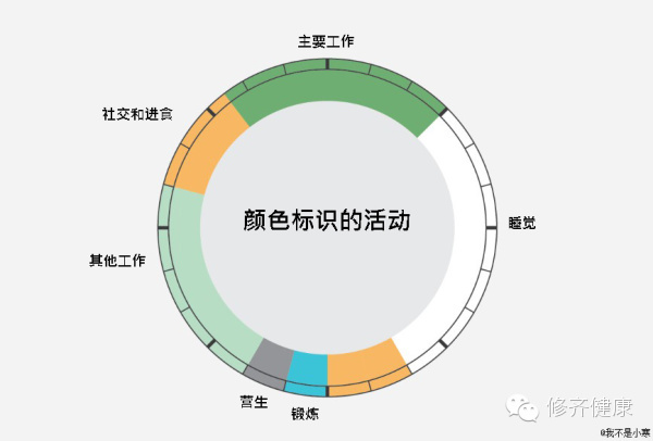 不同颜色区分也显示出每日的各方面活动:白色为睡眠,绿色为主要工作,土黄色为社交及用餐,湖蓝色代表运动,灰色代表从事其他赚钱方式。