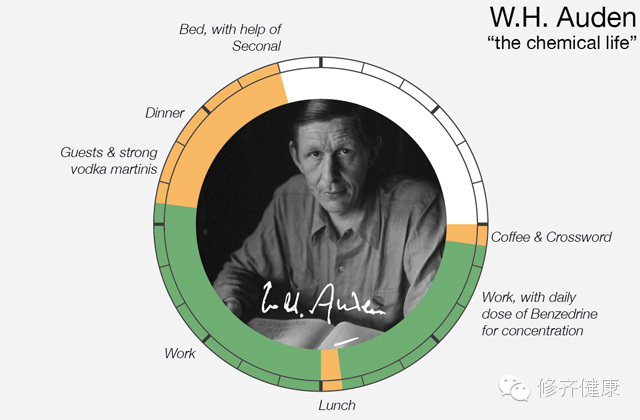 大诗人 W.H. 奥登也非常推崇固定的日程表,坚持在早上 7 点至 11 点半工作。他曾说,“ 只有希特勒们才在晚上工作,诚实的艺术家们都不会这么做。”早起喝咖啡,工作时他需要服用苯丙胺来集中注意力,晚间喝烈伏特加马丁尼,靠速可眠入睡。奥登将这些药物当做“在精神厨房中减轻劳力的工具,尽管这些工具非常粗糙,很容易伤害到厨师本人,也经常出故障。”