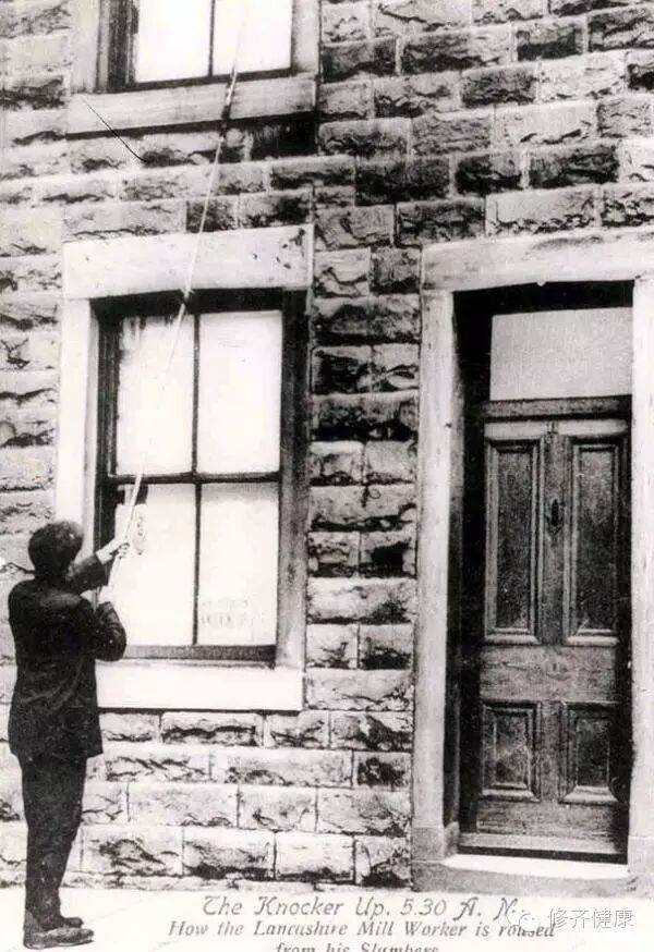 这些人通常被称为“巡逻吹哨人(knocker-uppers)”他们会沿着一条设定好的路线走动,用长杆轻叩窗户,扔石子或是大吼来提醒他们的客户以确保他们准时起床。