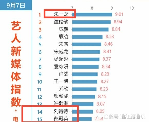 与这个结果形成鲜明对比的,是女主刘诗诗第14,男二彭冠英第15的排名。