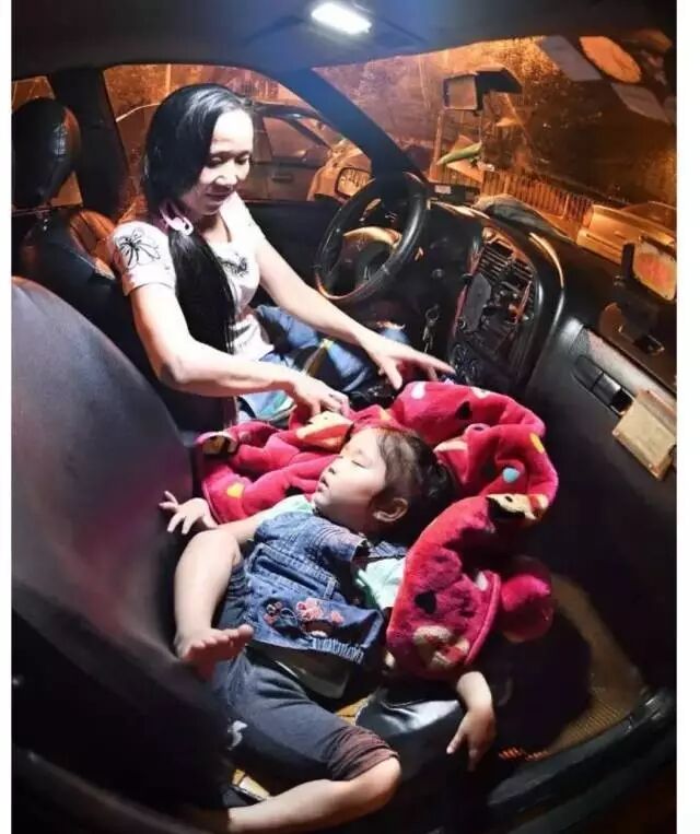 睡在副驾驶上的女孩,睡在妈妈背上的孩子,虽然他们缺了一张舒适的床,但是妈妈的怀抱和陪伴就是他们童年最温暖的记忆。