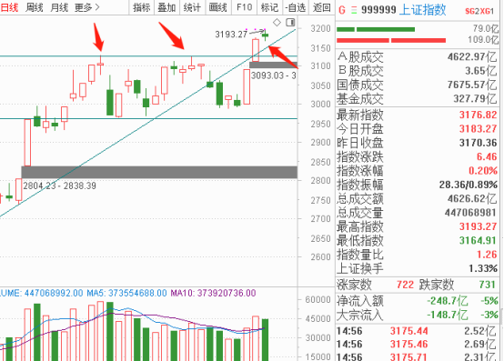 延续昨日上涨趋势,早盘高开在3183,3200的预期没有打到,盘中高点见3193,下午出现两波跳水 ,下午一些三连板个股出现炸板潮 ,指数震荡收假阴星,量能持平,市场未出现一致看多走势 ,而是在量能基本持 平的情况下,走出类似十字星走势 ,说明多空双方对后市走势,存在分歧。