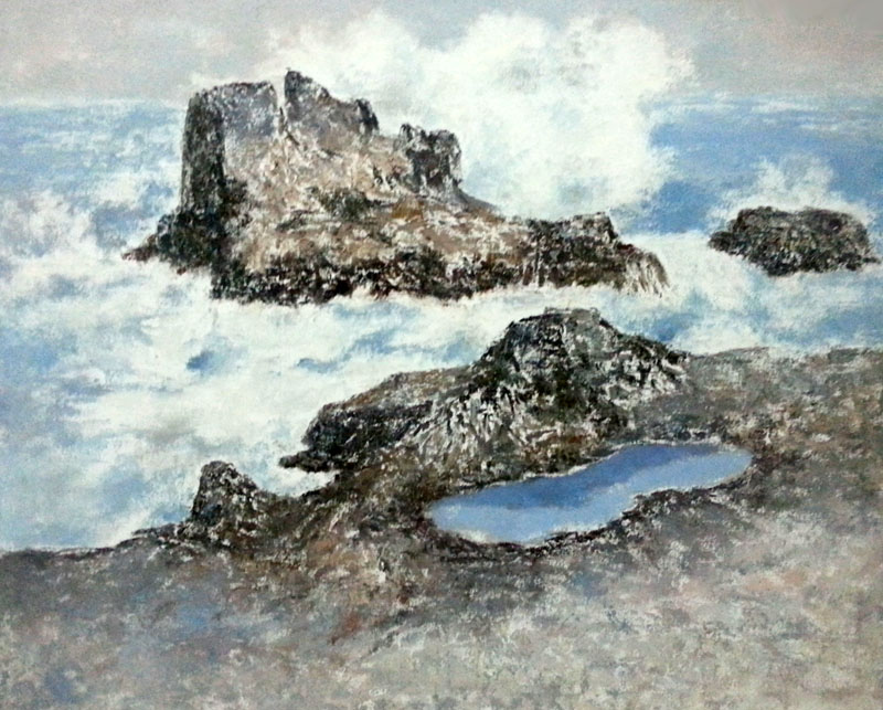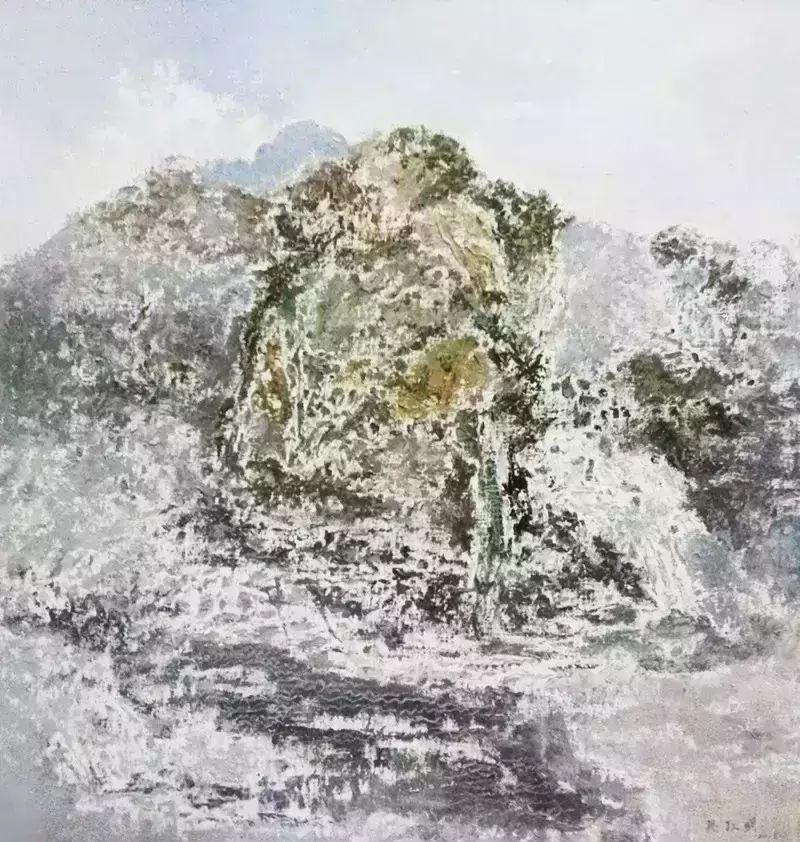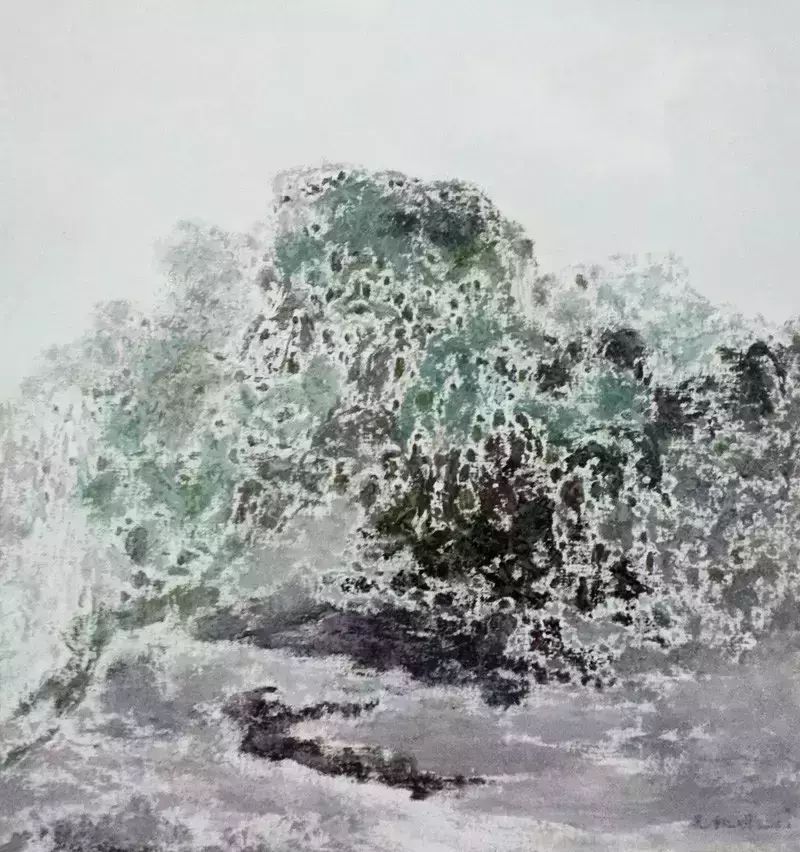 构图上用固定视点方法,选择某一景物的典型形态来表现,以达到文人画的韵味。例如海景画来源于画家对家乡的热爱,画面的视点处理较低。构图十分稳定,但突出了岩石的嶙峋和突兀,并借助于中国画的留白手法,用错位不定线条表达对象的微妙变化,但线的价值却体现在造型的刻画上,形成了他的油画山水的面貌。