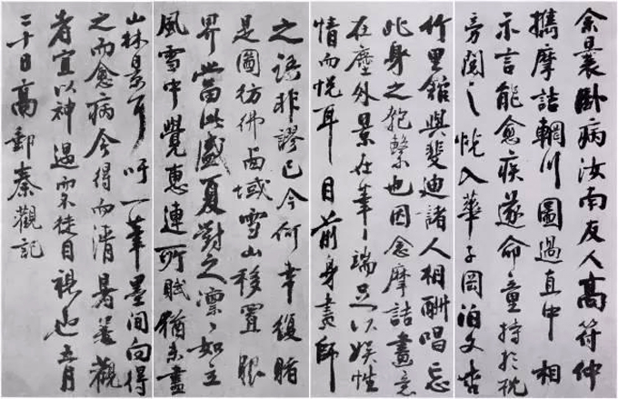 余曩卧病汝南。友人高符仲携摩诘辋川图。过直中相示。言能愈疾。遂命童持于枕旁阅之。恍入华子冈。泊文杏竹里馆。与斐(应作裴)迪诸人相酬唱。忘此身之匏系也。因念摩诘画。意在尘外。景在笔端。足以娱性情而悦耳目。前身画师之语非谬已。今何幸复睹是图。仿佛西域雪山。移置眼界。当此盛夏。对之凛凛如立风雪中。觉惠连所赋。犹未尽山林景耳。吁。一笔墨间。向得之而愈病。今得之而清暑。善观者宜以神遇而不徒目视也。五月二十日。高邮秦观记。