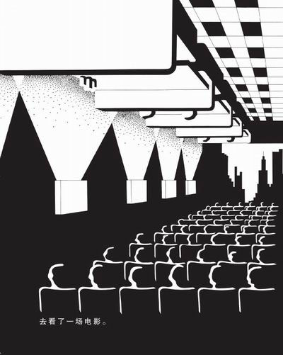 这不是一本彩色的图画书,而是一本只有黑白两色的书。利用视觉上色块的错觉,一图两景,使得正着看和倒过来看得到完全不同的场景。这里的大桥成了那里的电线杆,这里的屋檐成了那里的汽车……十分奇妙。