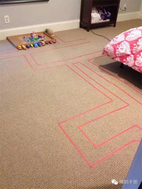 1、在地毯用彩色胶带画出道路,让孩子们玩玩具车游戏