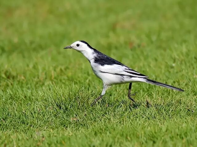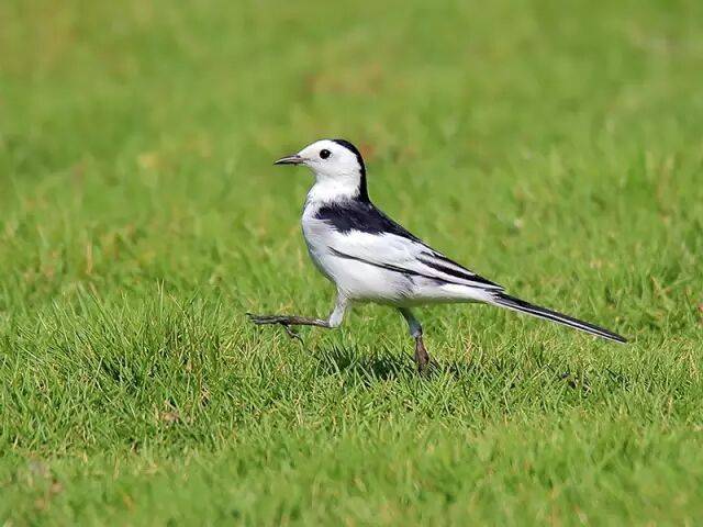 体长约20厘米。前额和脸颊白色,头顶和后颈黑色。体羽上体灰色,下体白,两翼及尾黑白相间。冬季头后、颈背及胸具黑色斑纹但不如繁殖期扩展。黑色的多少随亚种而异。雌鸟的色较暗。亚成鸟灰色取代成鸟的黑色。停栖时,尾常上下不停地摆动,有时还边走边叫,显得悠然自得。