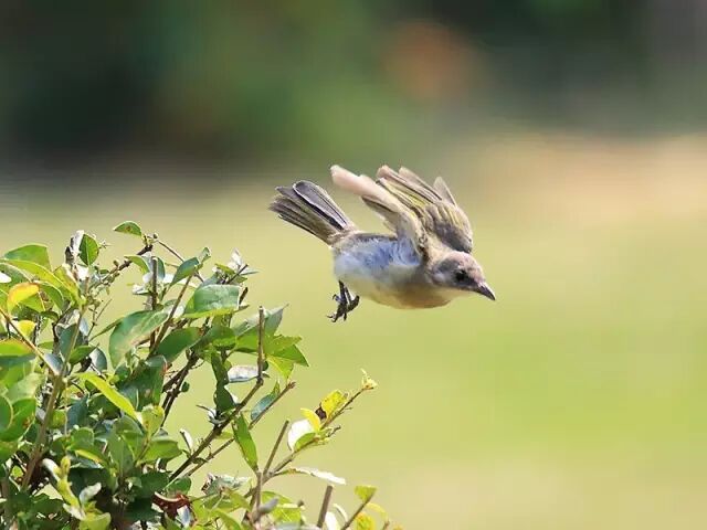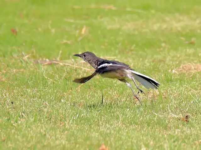 那是8月份最后一天的早晨,在初秋的晨光下,我发现这块小草坪上有地上爬的、草丛上飞舞着的各类小虫子。于是从旁边的树上看到后,就立即飞了下来,开始捕捉飞来飞去的小虫子用来充饥。当吃得差不多时,再飞往周边的树上稍作些憩息,过一会儿再下来觅食。如此在一个多小时内,就从树到地往返了好多次,到底吃了多少虫子,自己也一时说不清楚了。