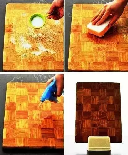 先洗干净案板,再在案板山撒上白盐,用刷子把案板刷一遍,半分钟后,用清水洗干净,撒上白醋,自然风干即可。