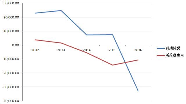 2014-2016年,乐视的利润总额为7289.91万、7416.92万、-3.29亿,同期所得税为-5589.75万、-1.43亿、-1.07亿。