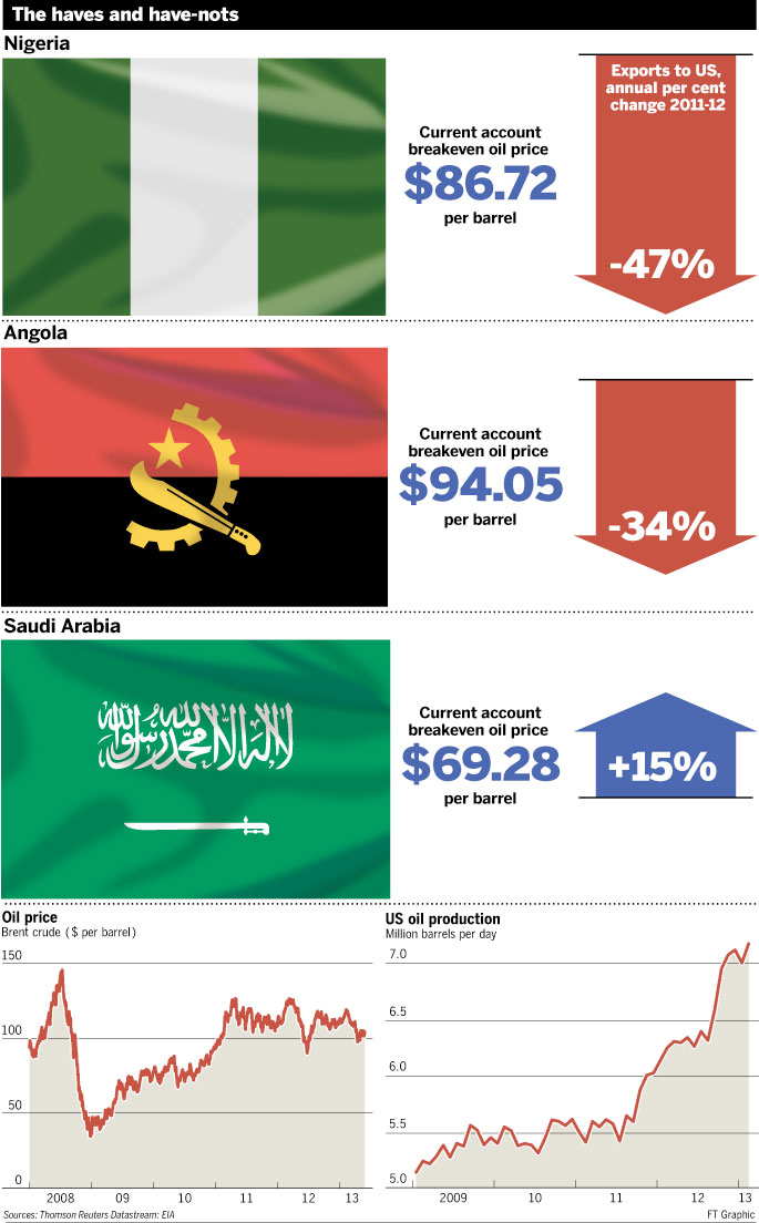 有着巨额财政储备的海湾国家有一定能力应对油价下跌,但诸如尼日利亚这类国家就依赖大量的石油收入来取得收支平衡。华盛顿咨询机构PFC Energy估测,2013年,在平均油价为每桶87美元的情况下,尼日利亚的石油收入能够覆盖其进口支出。对安哥拉来说,达到收支平衡则需要油价维持在每桶94美元。相比之下,沙特则只需要每桶70美元。目前国际基准油价——布伦特原油价格徘徊在略高于每桶100美元的水平。