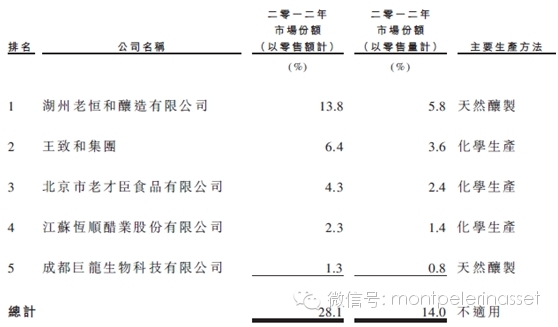 料酒市场也呈现这样的特点,2012年中国料酒销量中分别由50.5%和41.5%通过零售及餐饮渠道经销,其余8%通过食品生产和出口渠道销售。主要料酒品牌集中于零售渠道,原因为家庭通常有对高价料酒产品的需求和品牌意识。料酒主要用于烹饪鱼肉,起到提味去腥的效果。老恒和的料酒为黄酒酿制类别,由于料酒与黄酒、白酒都可以用于去腥,不在意烹饪品质的个体消费者不会在乎料酒,而追求品质的个体消费者必然选择市面上能形成消费力和品牌力的料酒必然为高品质产品。2012年前五大生产商合计料酒市场份额,以零售额和销量计分别占28.1%和14%。